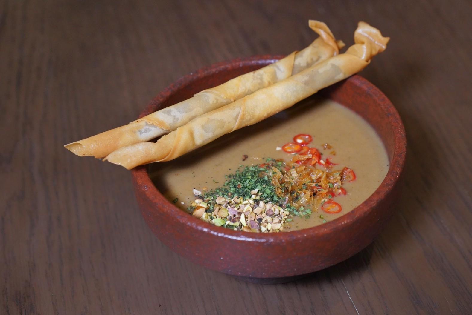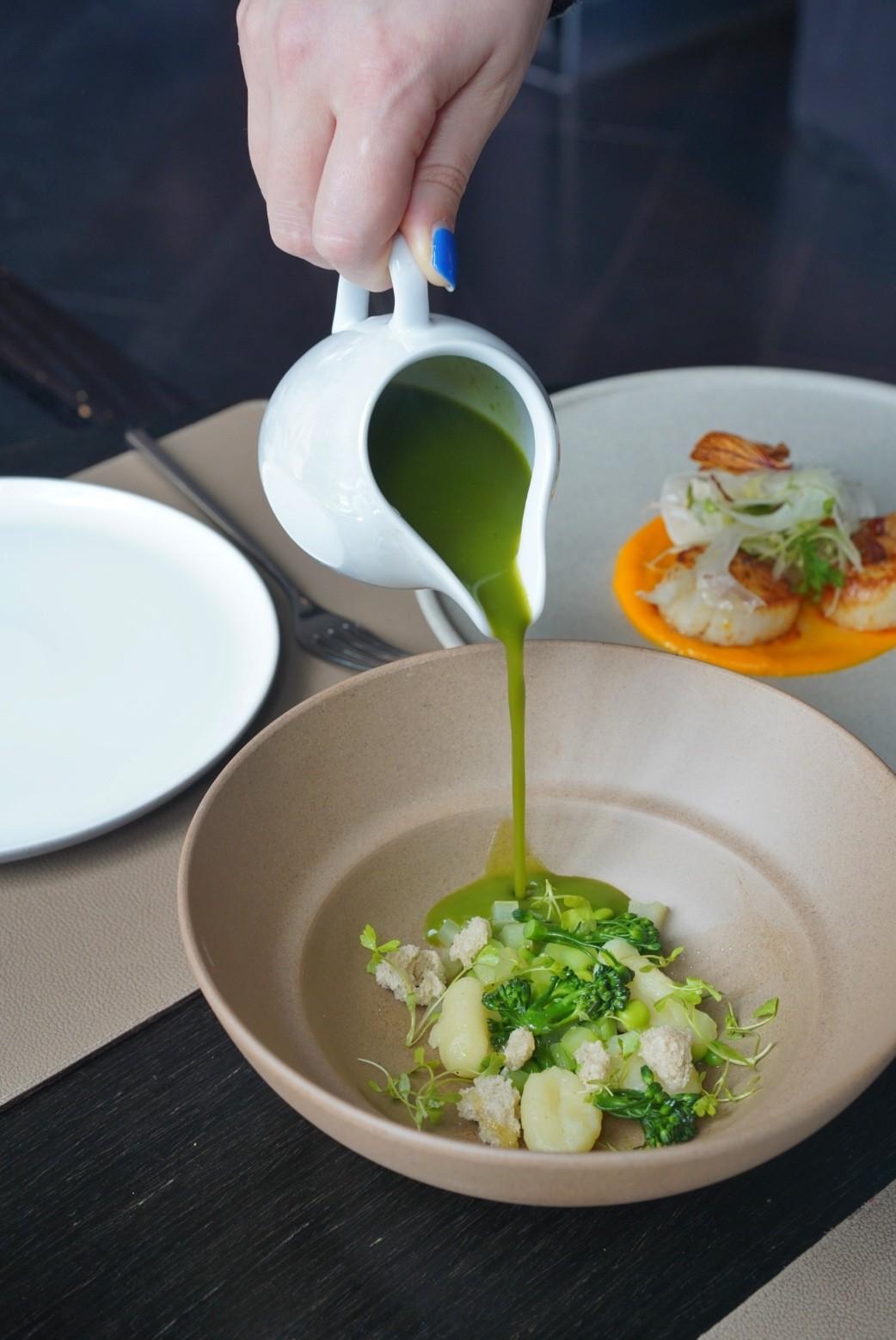 Poured deftly over celery, green peas and plush potato gnocchi, the soup is robustly herbaceous, earthy and slightly grassy, finished with bread crumb croutons.