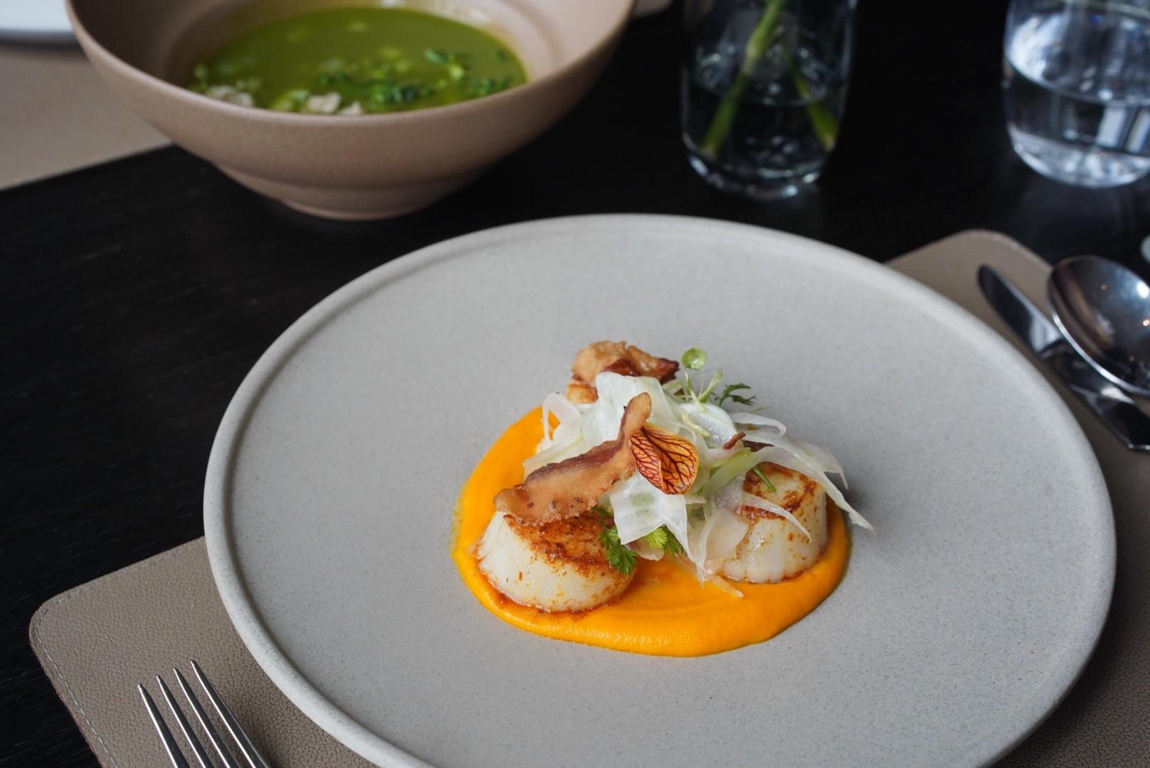 Equally supple, the Moroccan-spiced Seared Scallops (RMB188) rest on ginger carrot purée, adorned with crunchy fennel salad and fried guanciale crisps.