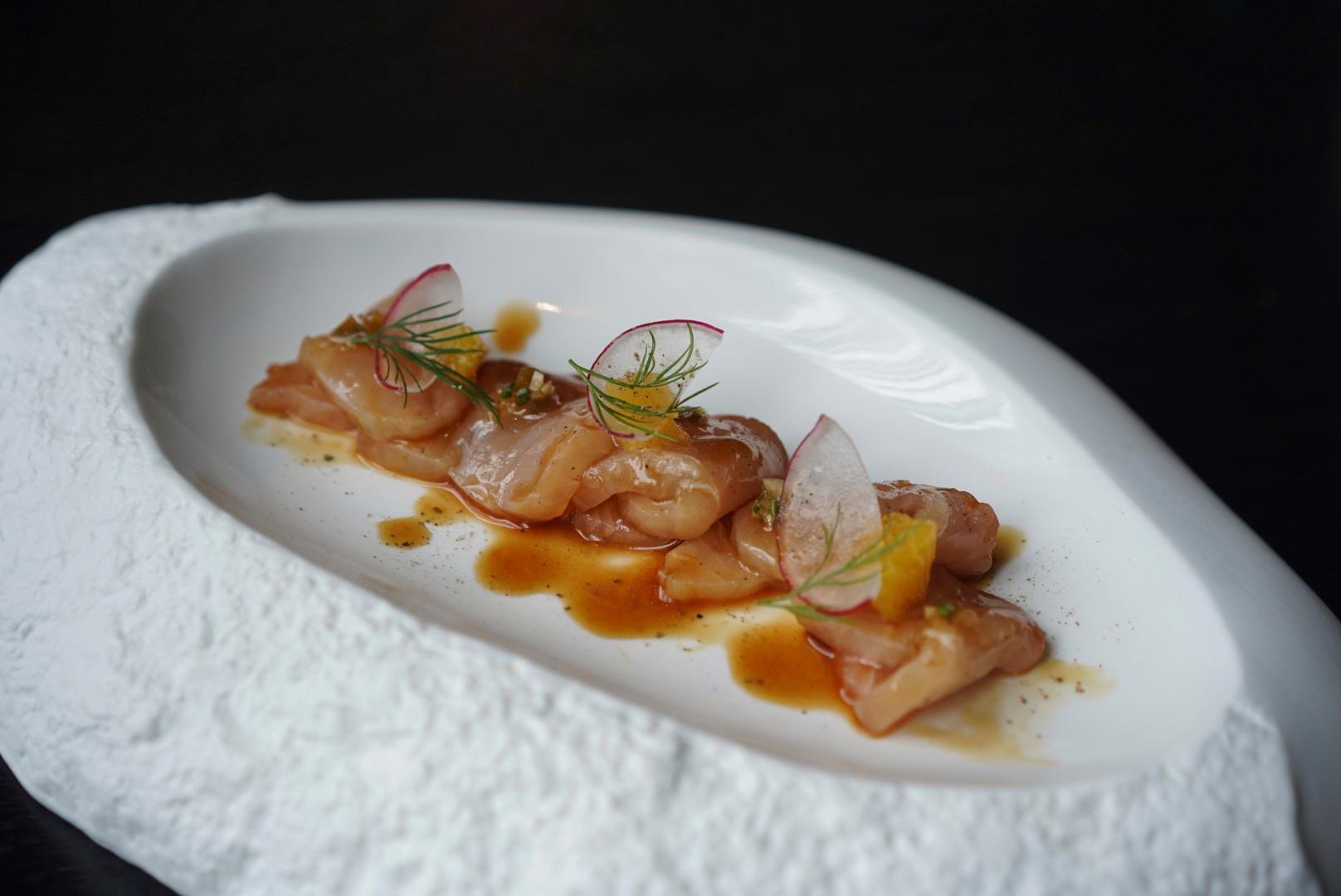 Starters begin with Citrus Yellowtail Crudo (RMB158), dressed in a Japanese ponzu glaze, finished with torched orange.
