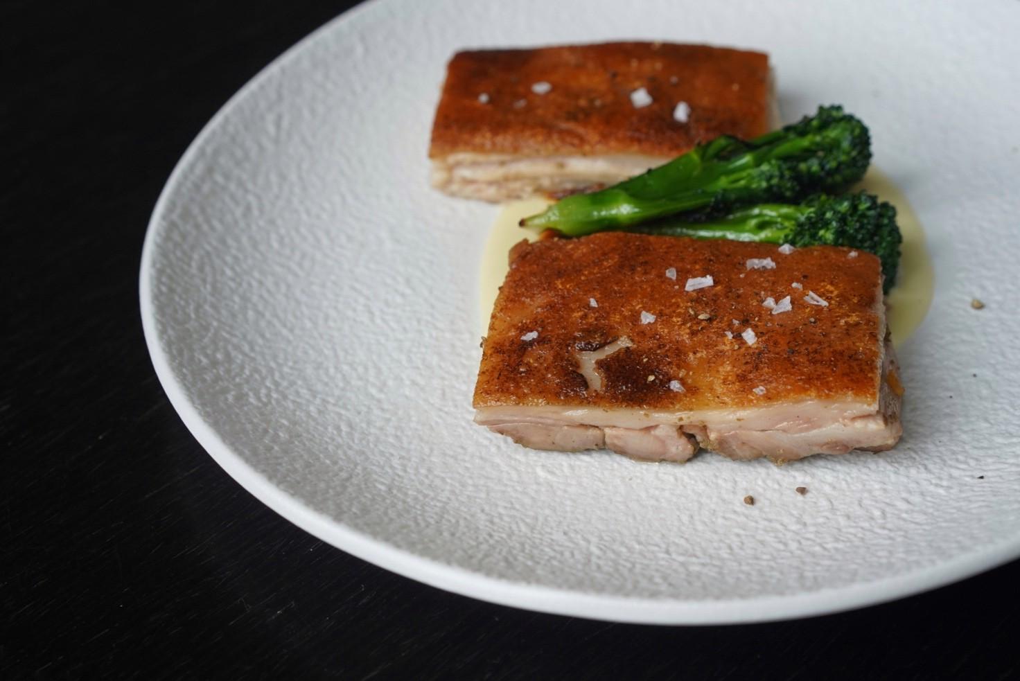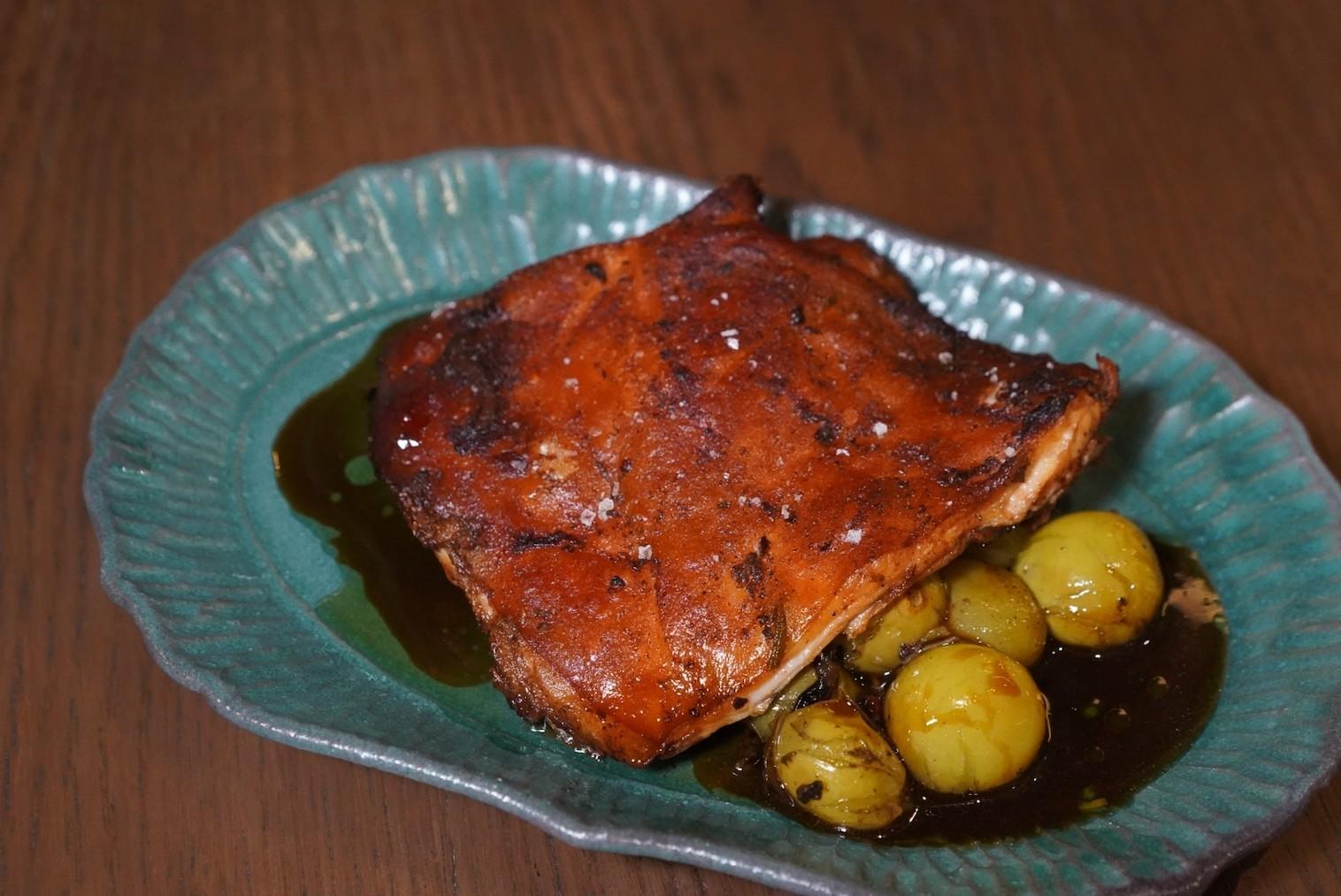 Guaranteed to be younger than three months old – ensuring the supplest of flesh – each pig is first smoked in the Bertha oven, and then marinated in a confidential five spice-like blend, before being sous-vide with green grapes for another 24 hours.