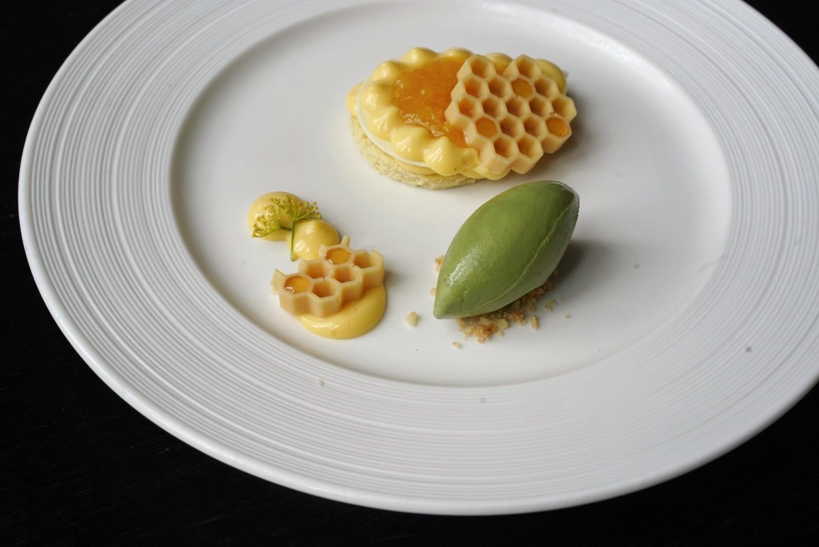 Alternating hexagonal cells of honeycomb-shaped white chocolate are filled with Yunnan honey, balancing on a mandarin compote Kalamansi Cream (RMB78).