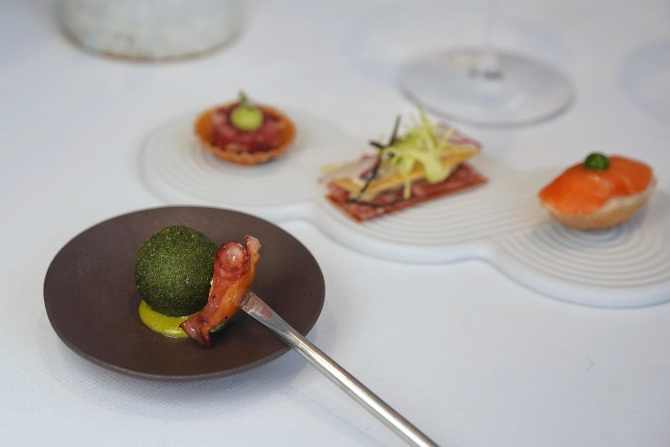 Other nibbles follow: a salmon salad puff capped with cured salmon and a daub of parsley aioli; beef and tuna tartare with avocado purée; a warm parsley and bread crumble coated sphere filled with snail and crowned with a charred octopus tentacle; and – like a Michelin-starred version of a sports bar snack – a homemade potato crisp stacked with dried sausage, French cheese, and a drizzle of red wine vinaigrette and olive oil.