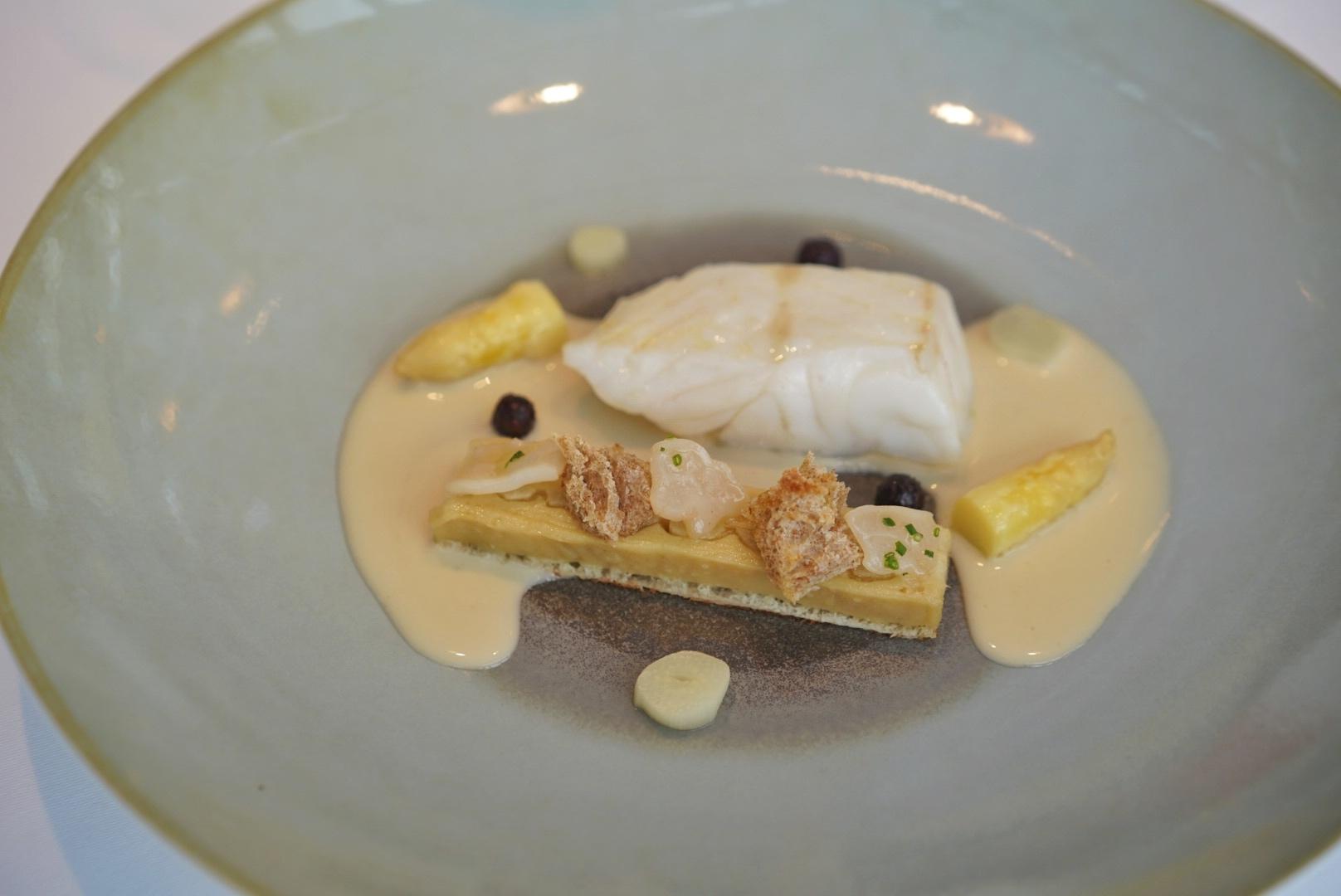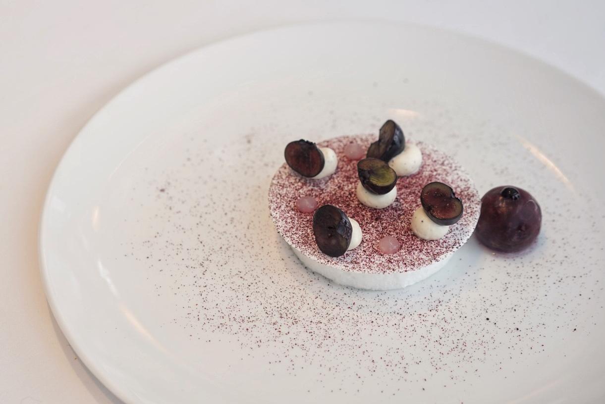 Unassuming pearls of blackcurrant reduction lend a pop of brightness – in color and flavor intensity – to the monochrome palette, a plate that is at once muted and refined.