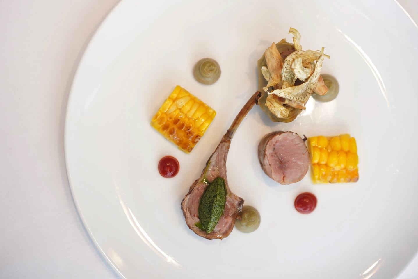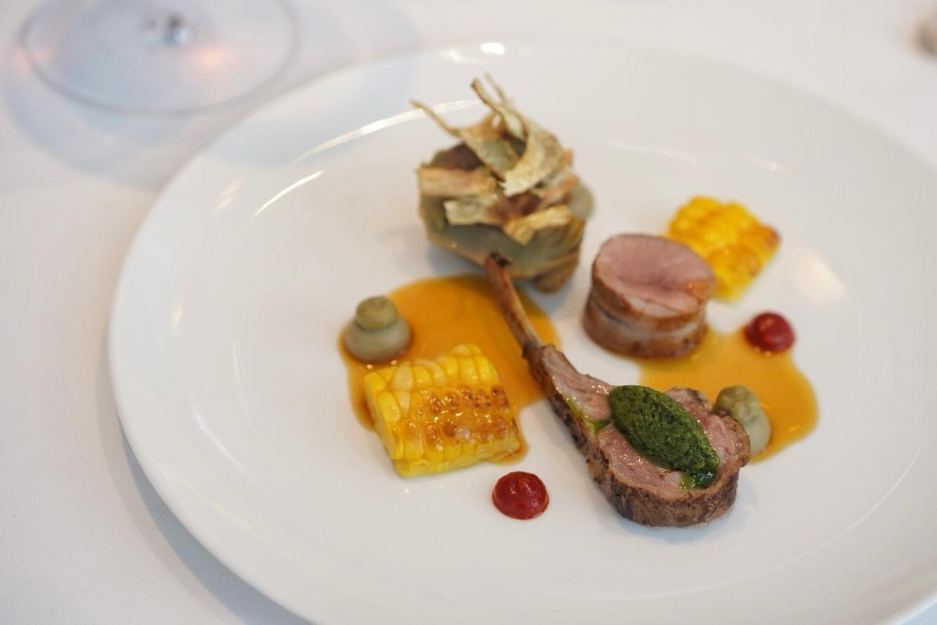 A masa-esque corncake is sheathed by torched sweet corn kernels, while a trio of artichoke – steamed, puréed, and crisped – is stuffed with a lamb shoulder sausage.