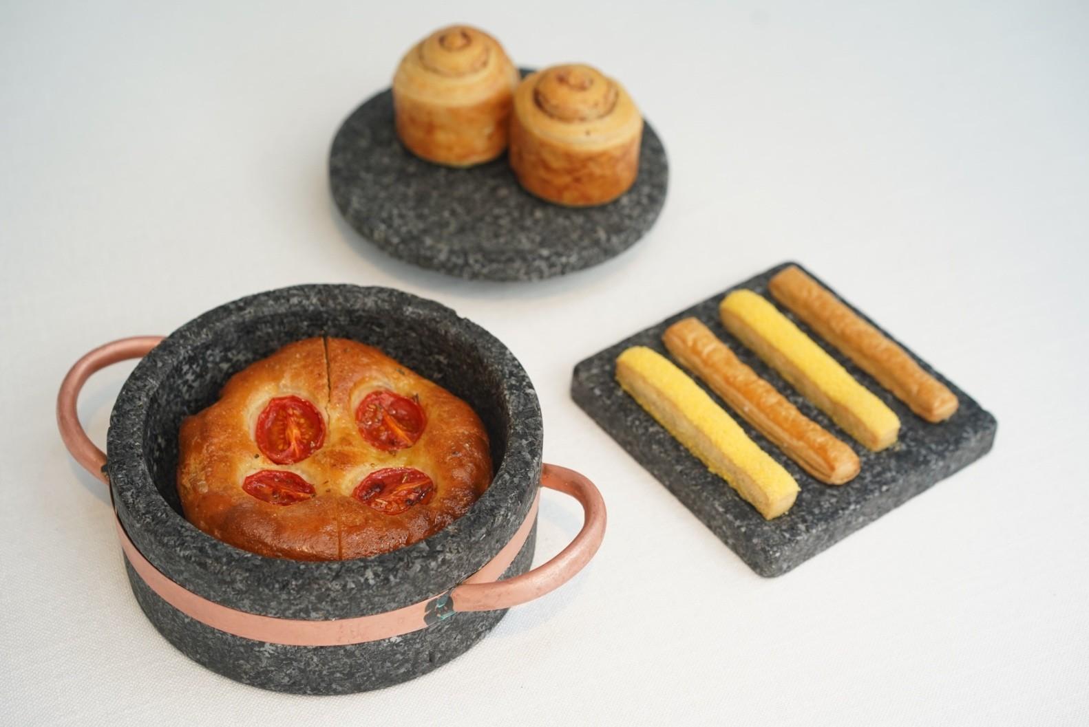 Bread Selections – Focaccia, Black Olive Swirl Puff Bread, Corn and Mille Feuille Grissini flecked with Malton sea salt)