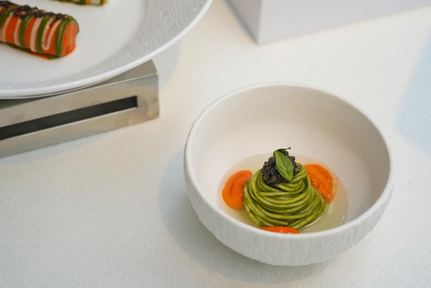 … while Sichuan-sourced Oscietra caviar crowns pesto-laced Angel Hair Pasta, delimited by unctuous Dalian sea urchin, and steeped in a puddle of clarified tomato water.