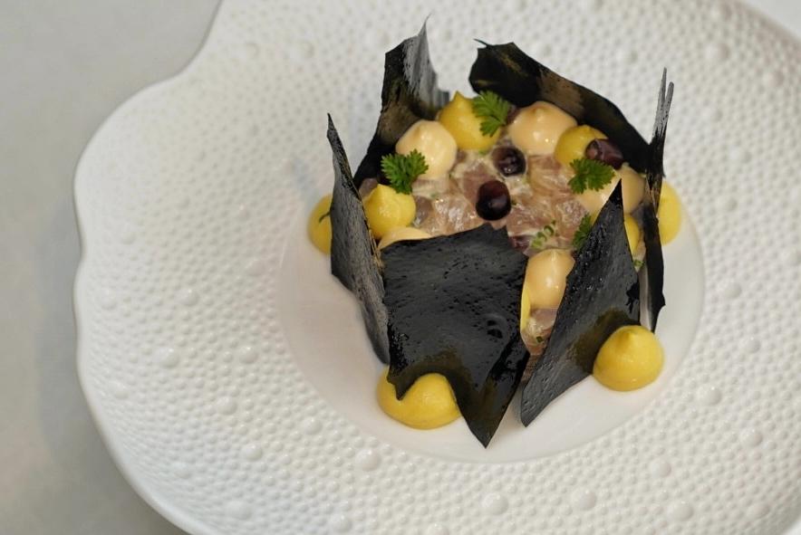 A favorite of the lot, the Fujian Amberjack Tartare sees interspersed dollops of corn purée and homemade mayonnaise, bordered by black potato crisps.