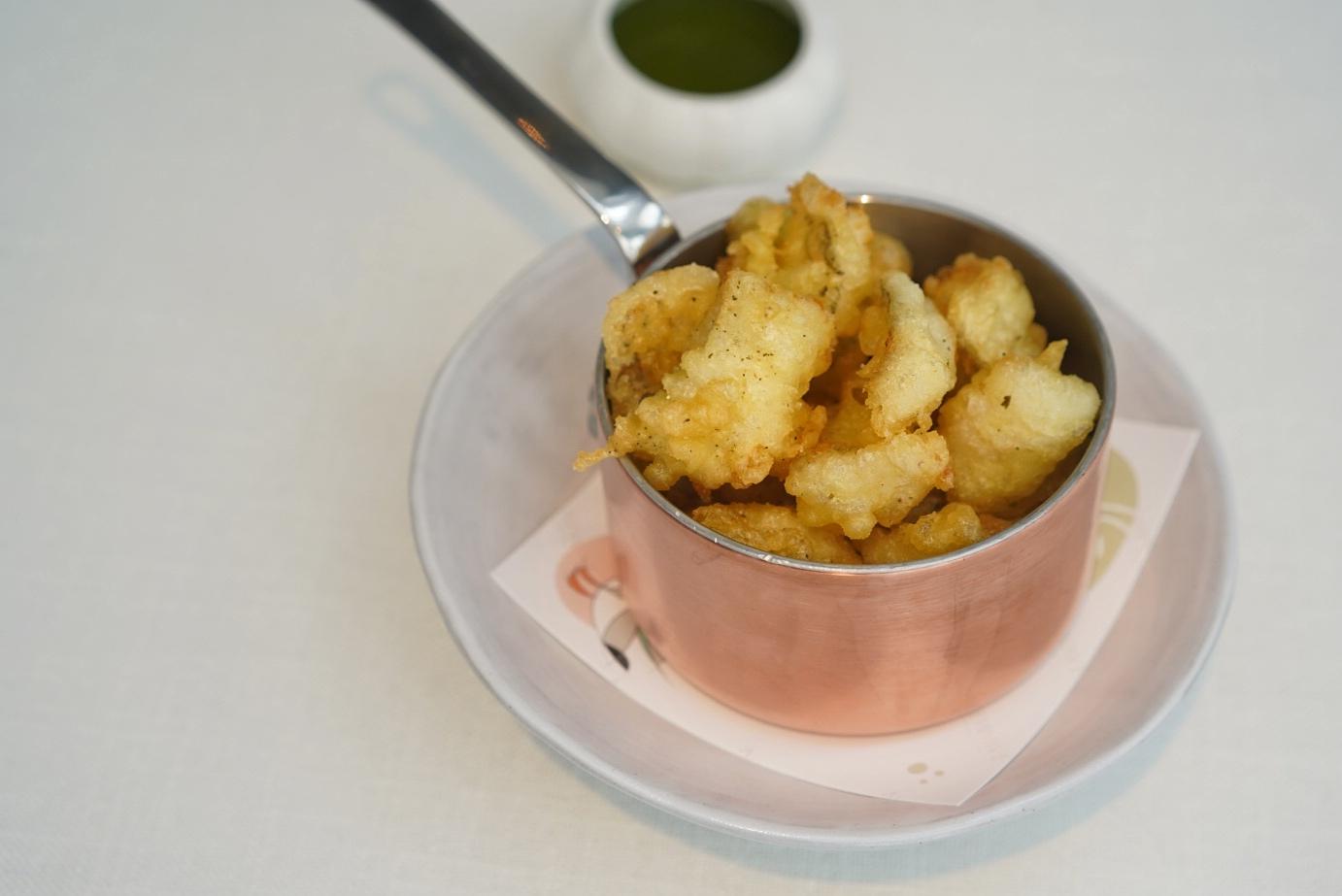 Tempura-esque batter coats the seasonal fish – in this case dragonfish – the corrugated nuggets acting as the consummate canvas for sopping up the parsley-based garlic and lemon sauce on the side.