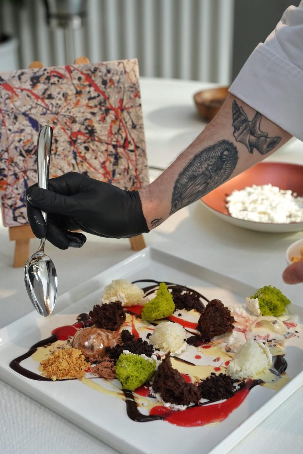 A lashing of vanilla, chocolate and strawberry sauces mimic Pollock’s signature 'Jack the Dripper' painting style, while a splatter of chocolate and vanilla milk foam balls follows in the same vein.