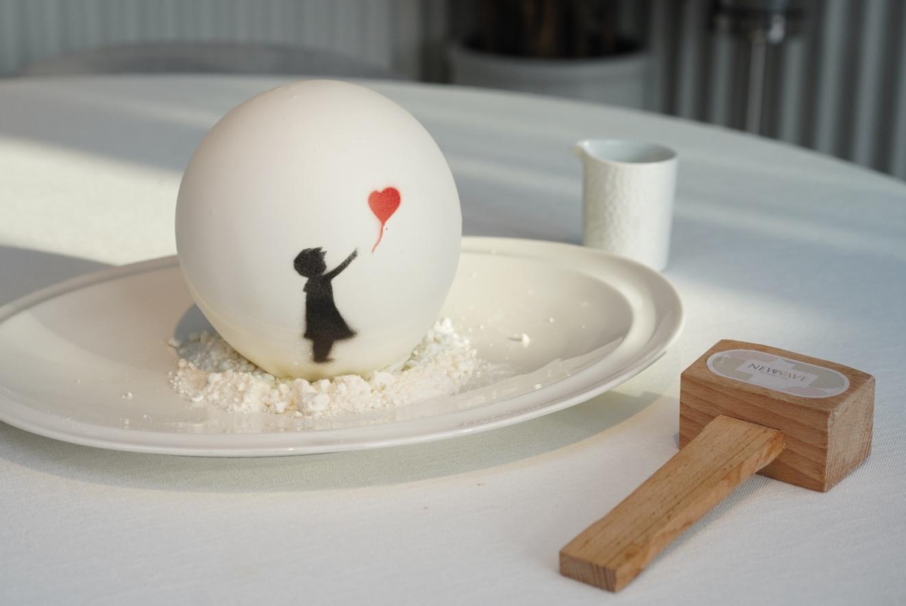 Interactive and playful is the name of the game with yet another dessert, this one paying homage to the mysterious street artist and political activist Banksy and his most replicated piece, Balloon Girl, first produced back in 2002.