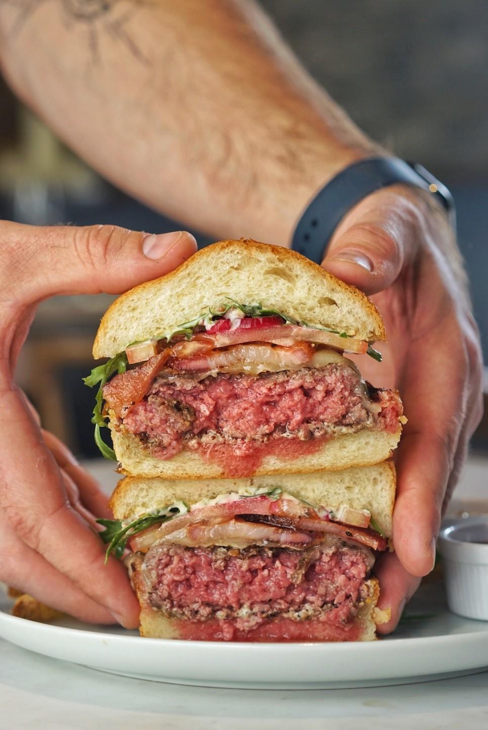 A house-ground, M3 Wagyu mix of 25% dry-aged beef with 75% fresh results in the optimal juiciest patty, flanked by gooey smoked provolone, house-cured bacon, beetroot-pickled shallots, truffle mixed arugula and a generous dollop of stoneground mustard horseradish aioli shmeared across a homemade brioche bun.