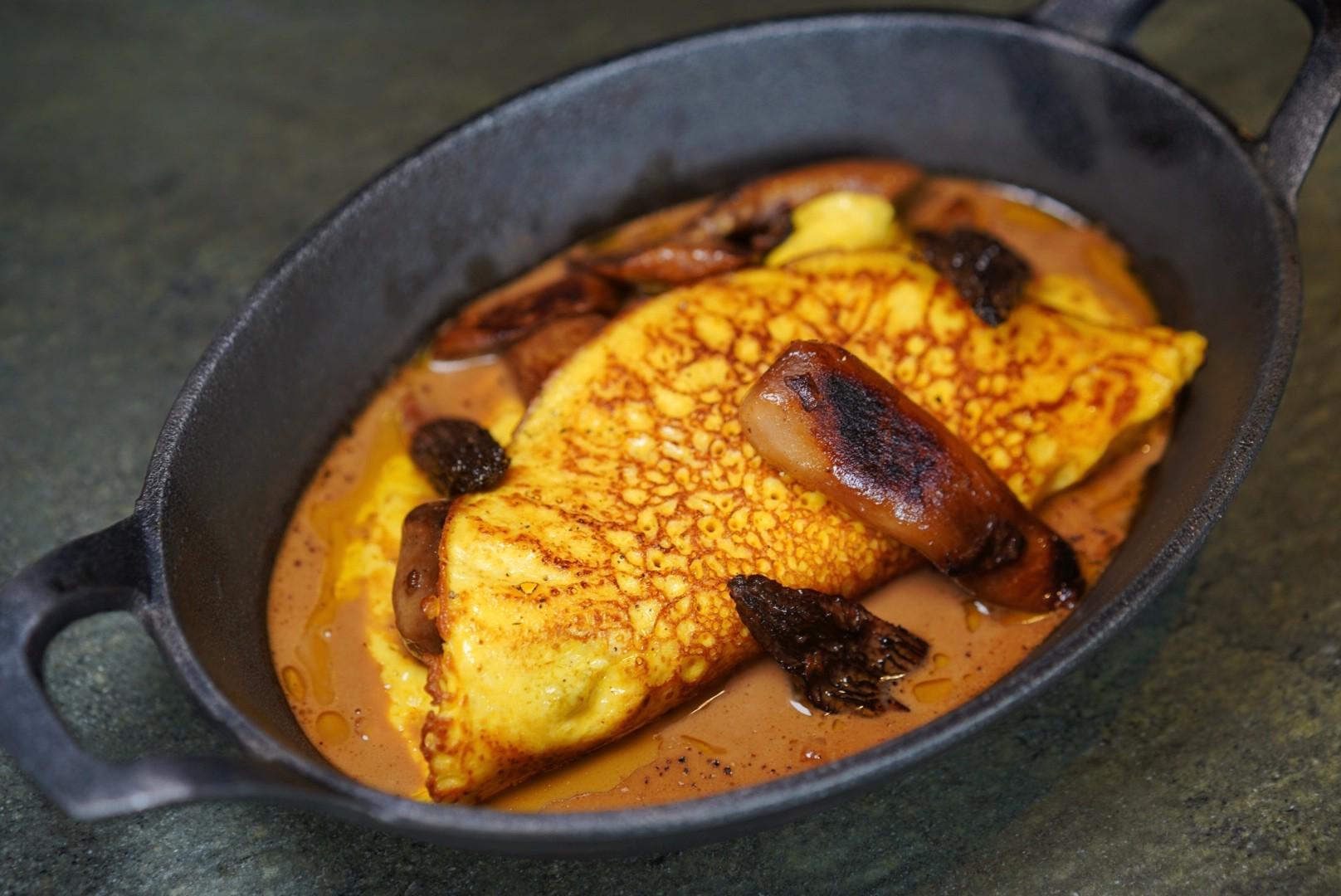 The buttery eggs are souffléd, anchored to the plate by an unctuous mushroom cream sauce.
