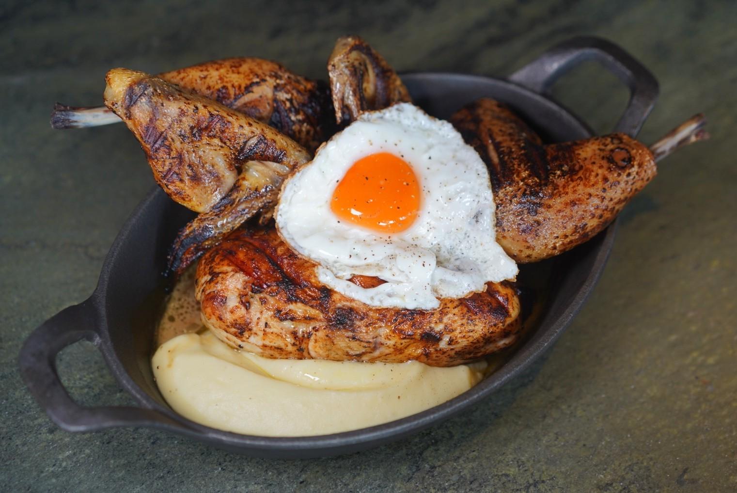 The bird perches atop a chicken gravy reduction, alongside creamy mash. For a real chicken-and-the-egg situation, there’s an olive oil-fried egg on top… because brunch.