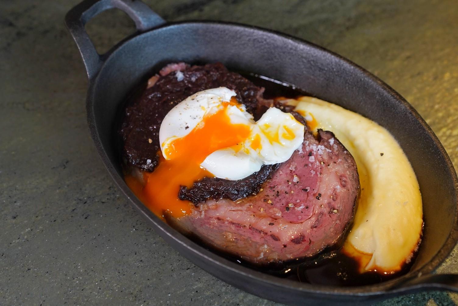 A moat of velvety mashed potatoes encircles the steak, while an expertly poached egg nestles in a bed of caramelized onions, dribbled with a red wine reduction; it’s a straightforward love triangle of beef, potatoes and onions, only further enhanced by a brunch-worthy runny yolk.