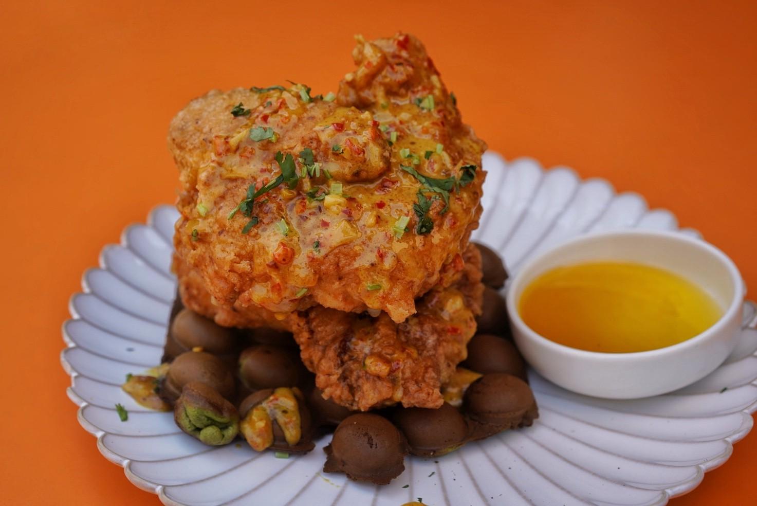 A Hong Kong-style bubble waffle boasts a sweet vanilla aroma and a pale green color due to the addition of pandan, while half a chicken is breaded and fried, doused in a spicy Thai curry sauce and balanced with a sweet honey butter drizzle.
