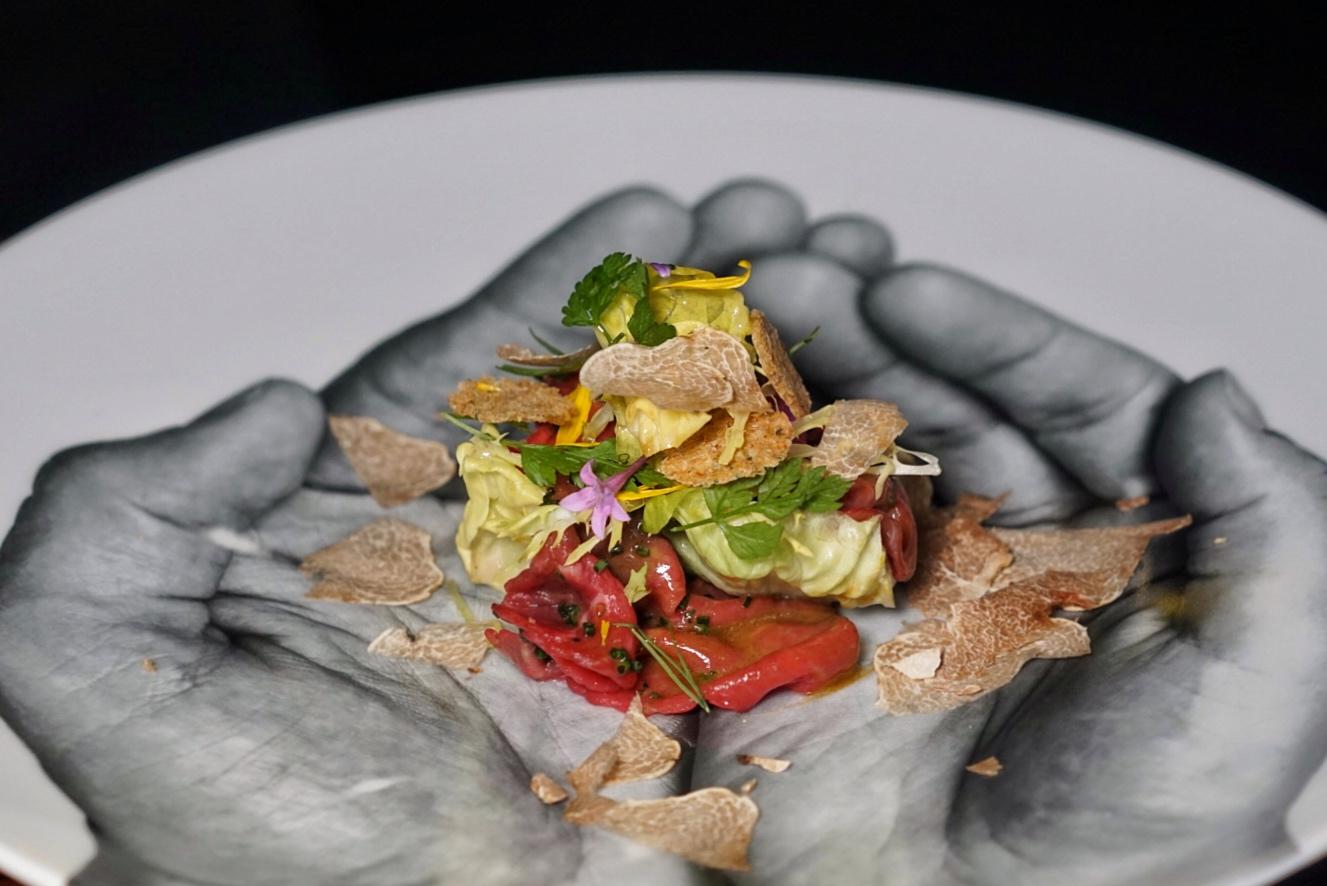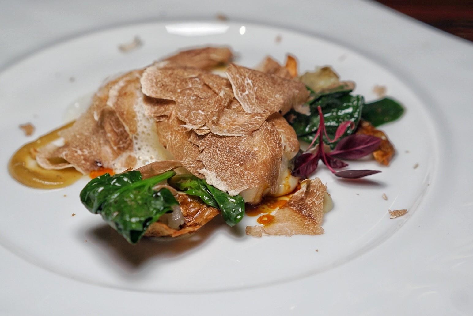 A play on a traditional French recipe, the L'oeuf Confit à la Truffe (RMB228) features olive oil confit egg yolk resting on a pancetta and garlic cream. A thin layer of melted Comté cheese encases the runny yolk, so it can be pierced with a forkful of Yunnan truffle – notable for its subtleness compared to other more bolder black truffle alternatives – and pickled mushrooms.