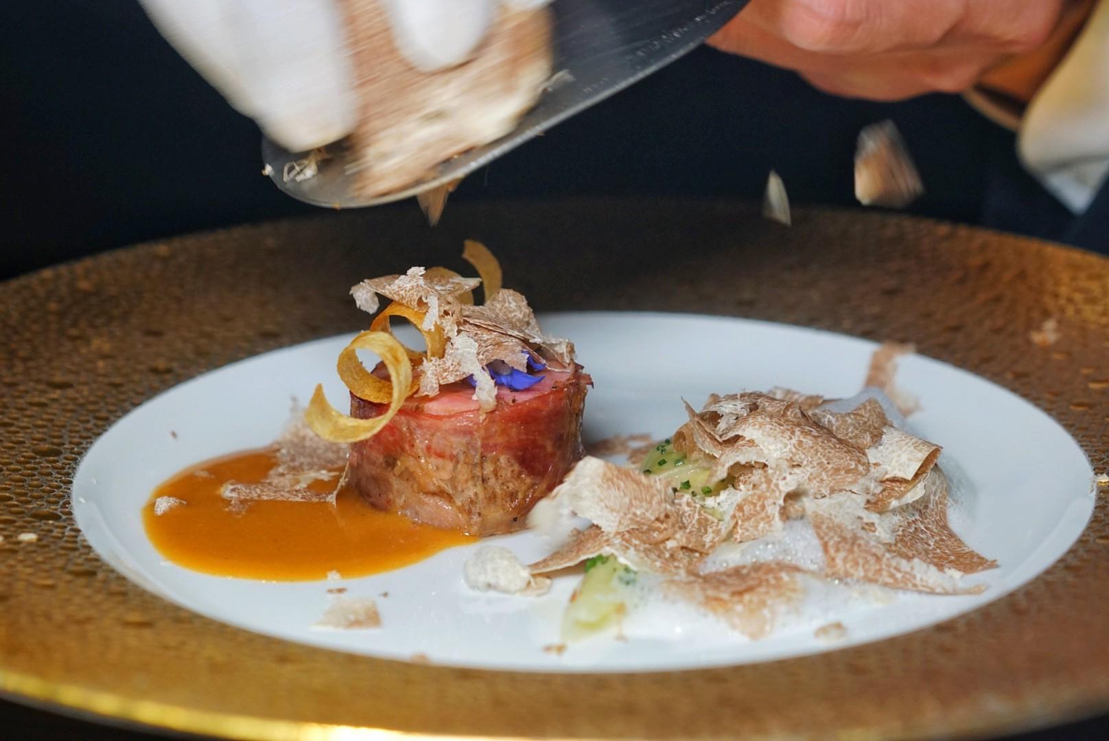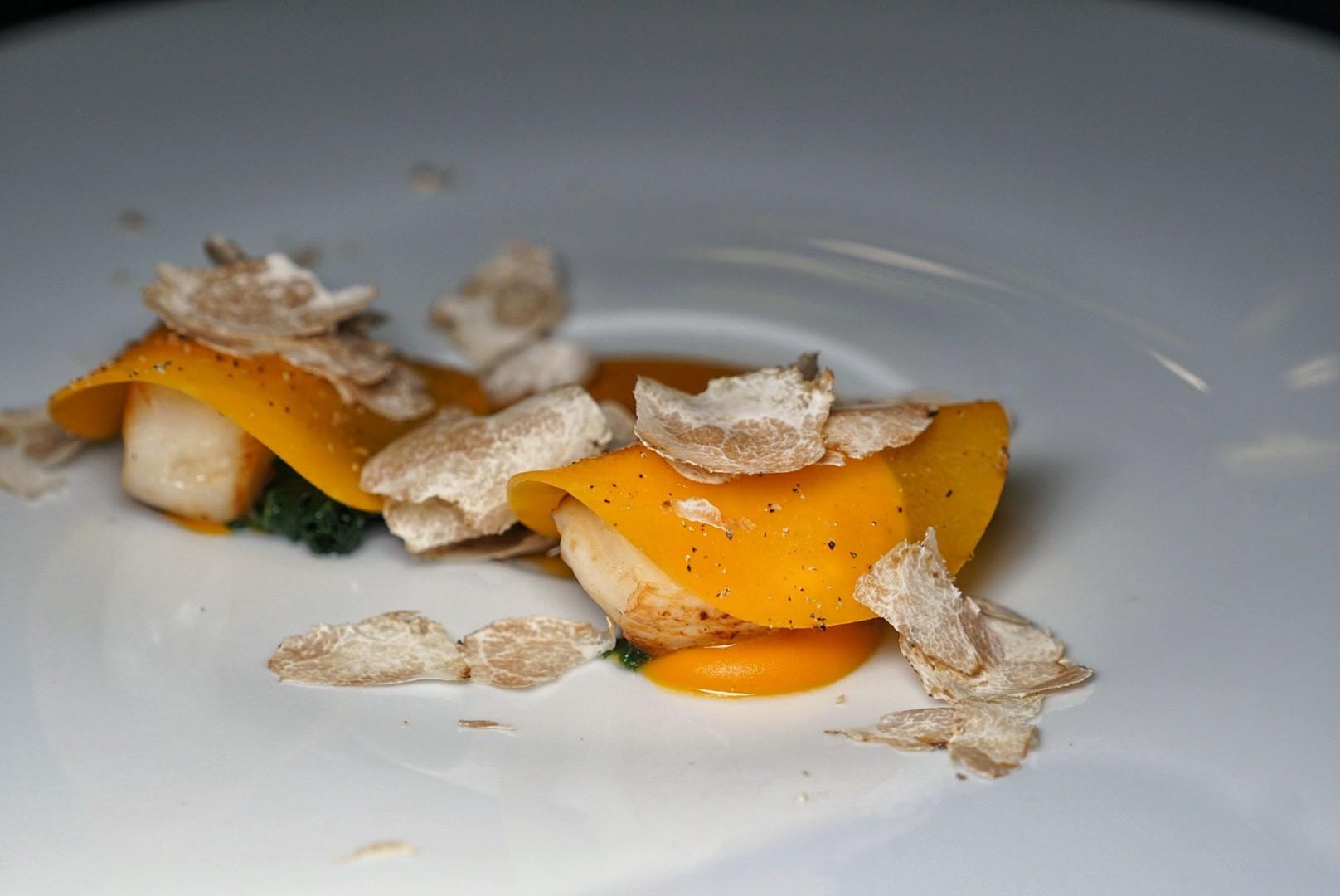 Pan-seared Hokkaido scallops rest on a hot butter and orange citrus sauce, interspersed with pumpkin purée as Le Saint-Jacques. A thin sheath of pumpkin swaddles the scallop, attracting the shaved truffle 'snow' that arrives tableside.