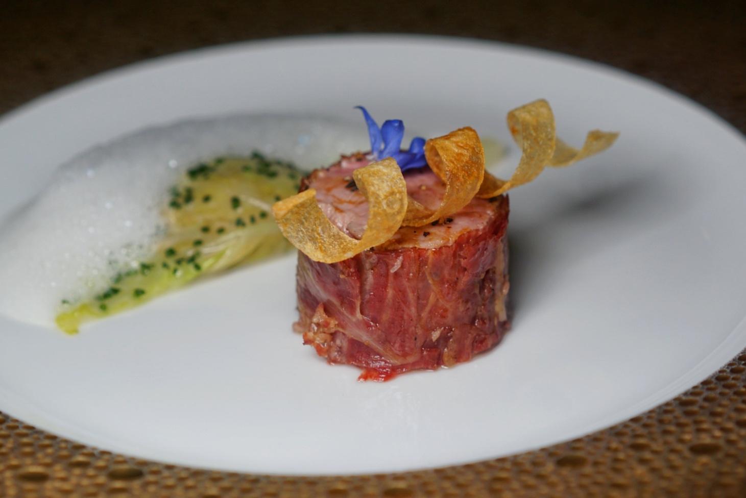 A circular round of veal tenderloin is served alongside a savoy cabbage ravioli as Le Veau. Applauded for its simplicity, the meat's gamey nature is enhanced by earthy truffle.