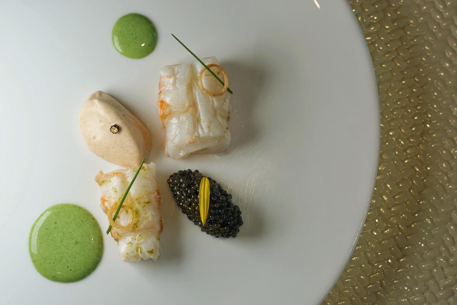 Starting with Le Caviar (RMB888), Nordic langoustine is lightly seared with lime and a blend of hazelnut and walnut oils, accented by a delicate quenelle of Kaluga Queen 10 years sturgeon caviar. A velvety bavaroise, or Bavarian cream sauce, is made from the langoustine head, filled out with cream. Verdant dollops add color and brightness as an additional caper, chives, hazelnut and rapeseed oil sauce.