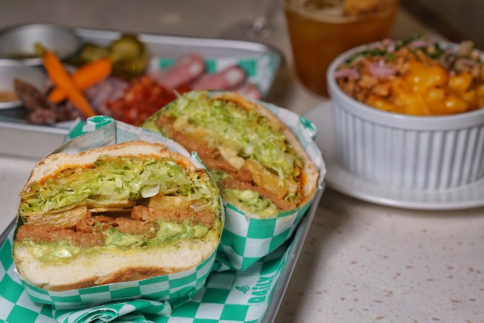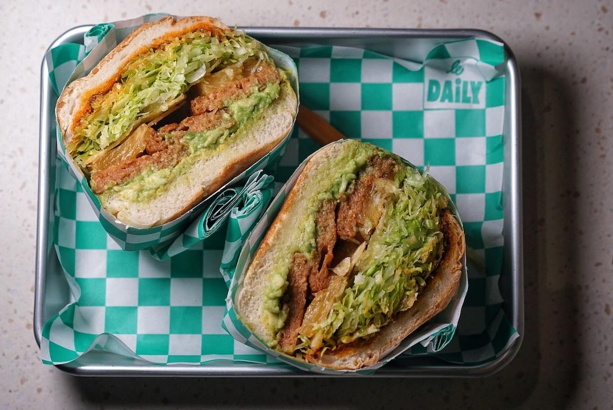Le Daily ensures that each menu rendition includes at least one vegetarian and one vegan sando, and the Spam & Pineapple (RMB78) falls in the later category, featuring plant-based Omnipork luncheon meat stacked high with an assortment of roasted pineapple slices, avocado, dill pickle, shrettuce, laoganma tahini, yellow mustard and chips for extra crunch. It's pretty much a rainbow between two buns. A giant, thick, flavor explosion of a rainbow.