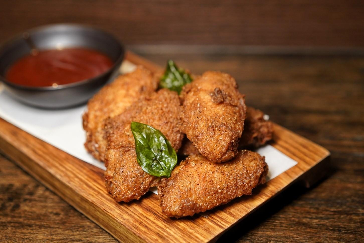 The Puli Fried Chicken (RMB148) is presented steaming hot with a side of homemade bourbon BBQ sauce and a sprinkling of fried basil.