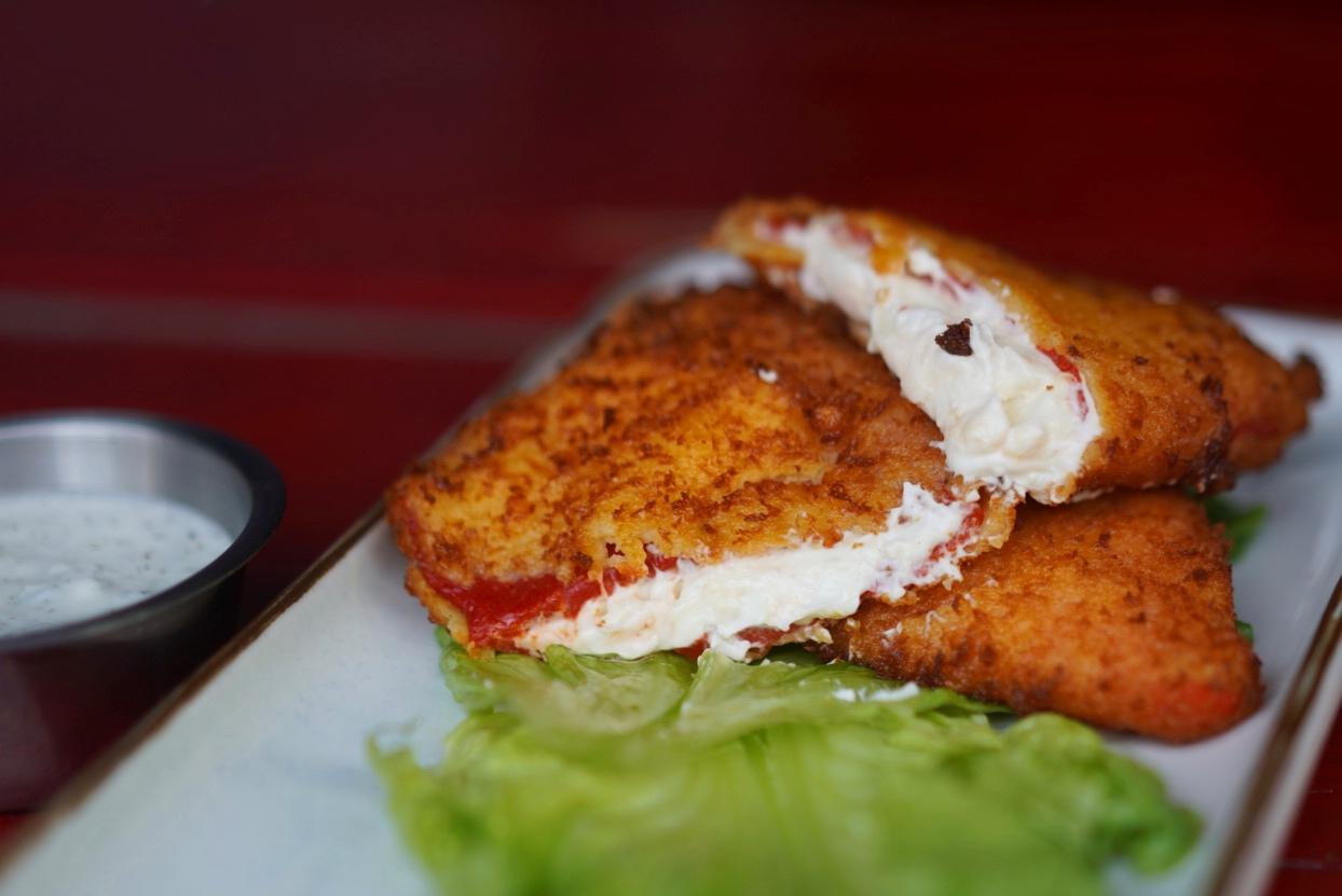 Other fried fare arrives in the form of Deep Fried Pepper (RMB68) two fist-size red bell peppers stuffed to the gills with a tangy Slav-style cream cheese, breaded and served with tzatziki for dipping.