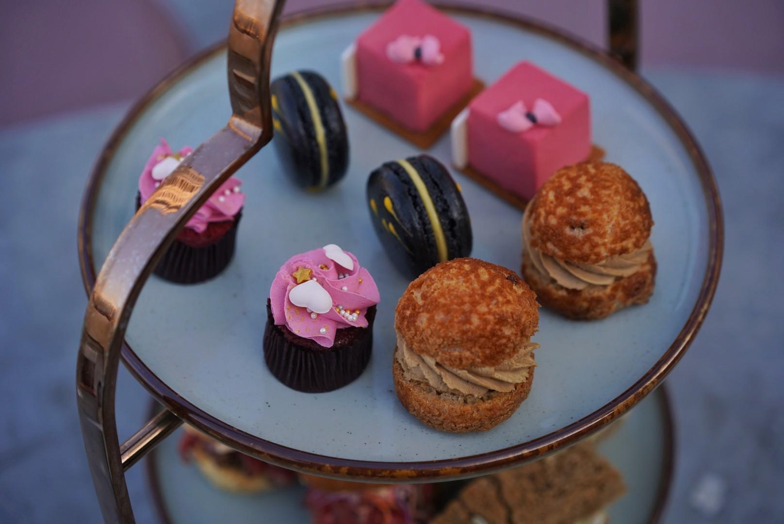 No afternoon tea set is complete without a little sugar, and that demand is met with Pink Rose Cupcakes – red velvet cupcakes decorated with rose petal icing and lime marshmallows – as well as Chocolate French Puffs, piped with espresso mousse and caramel-like dulce de leche.