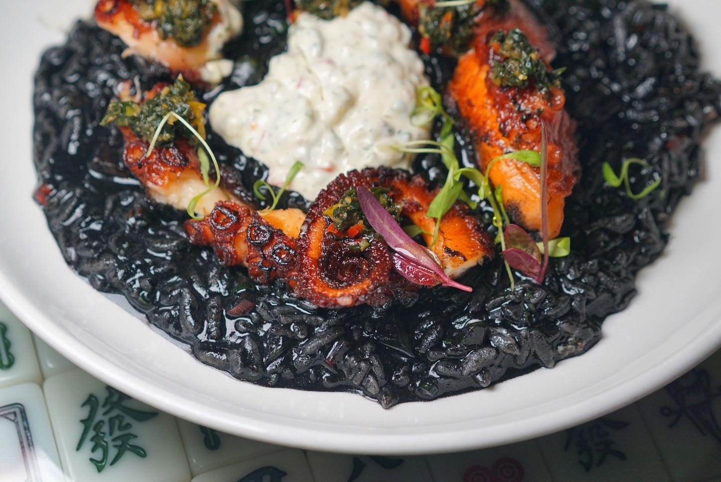 Flame-licked tentacles of Grilled Octopus (RMB158) adorn inky sweet rice spiced with piquant Hainan yellow chili and an Asian chimichurri.