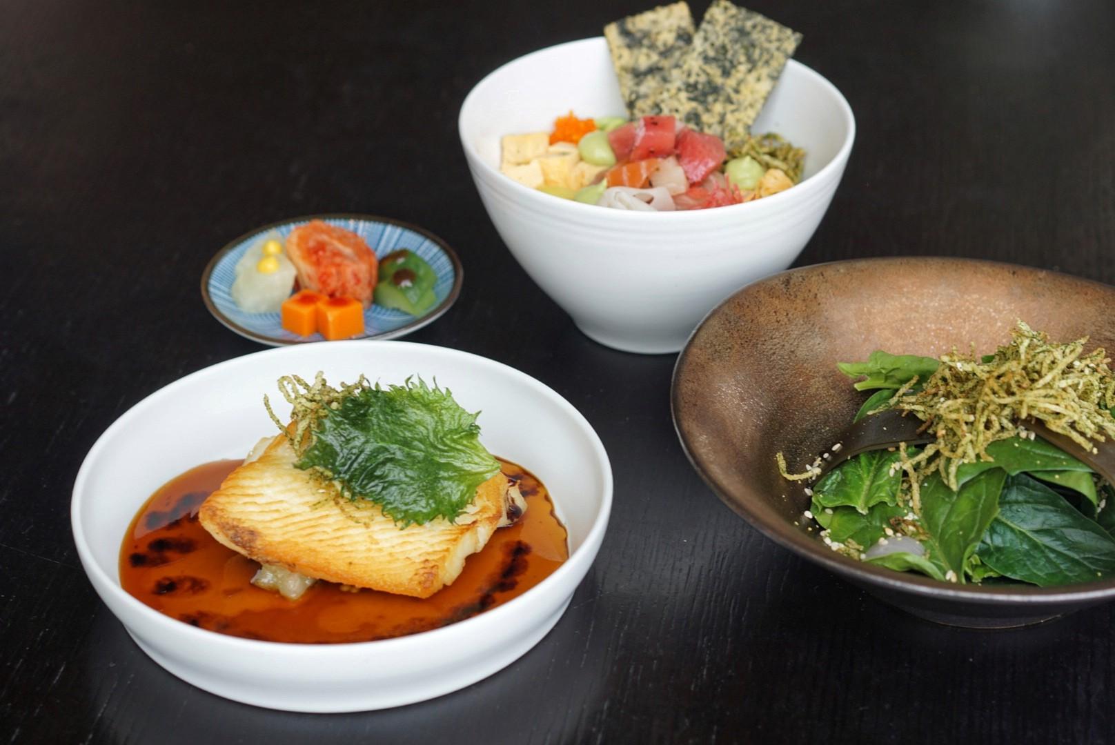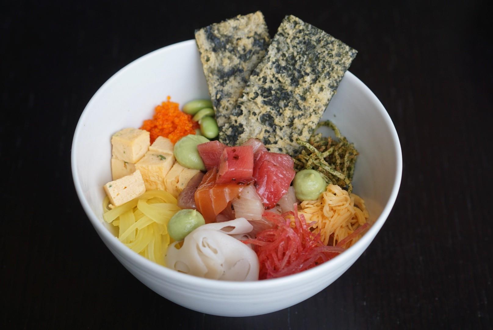 A Kyoto style chirashi bowl comes alongside, with marinated cubes of tuna and salmon, edamame, egg threads, beads of roe and wasabi cream.