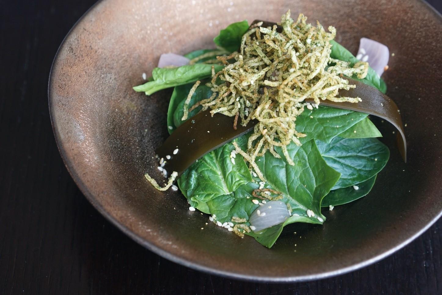 The beef gyudon is paired with a spinach salad – tossed with tangy tosazu dressing, nori and kombu seaweed bergamot – plus seasonal homemade pickles – like cucumber with plum sauce, daikon with mustard and carrots with sweet chili sauce, plus kimchi rounds.