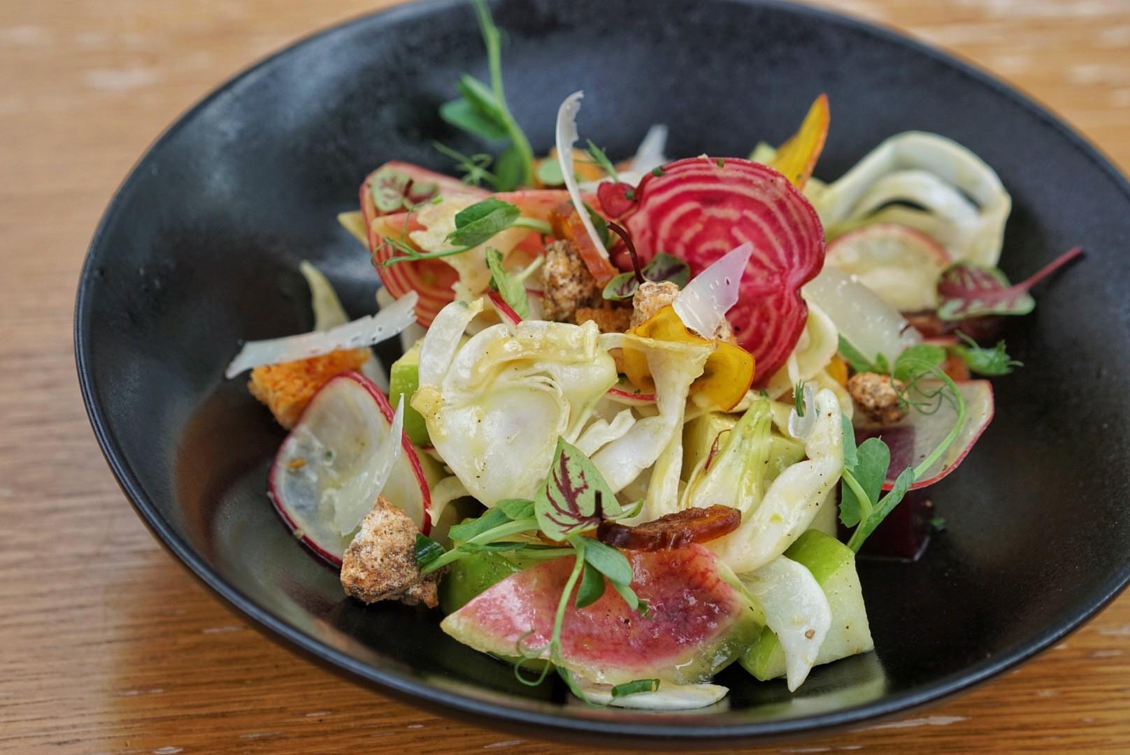 A spring garden on a plate, the Roasted Beet & Apple Salad is a cornucopia of fresh fennel, walnuts, dates, manchego cheese and sourdough croutons in a zippy orange sherry vinaigrette.