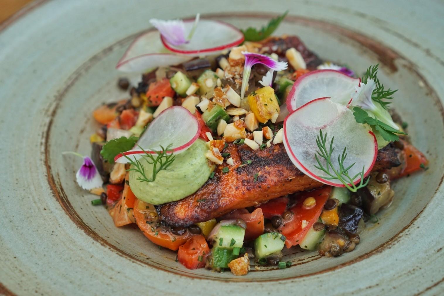 A charred crust forms on the expertly seared Pan Roasted Salmon, resting on a succotash of diced eggplant, zucchini, tomato and lentils. But the spring vibes go a step further with fresh herbs, candied almonds and velvety dollops of herb yogurt.