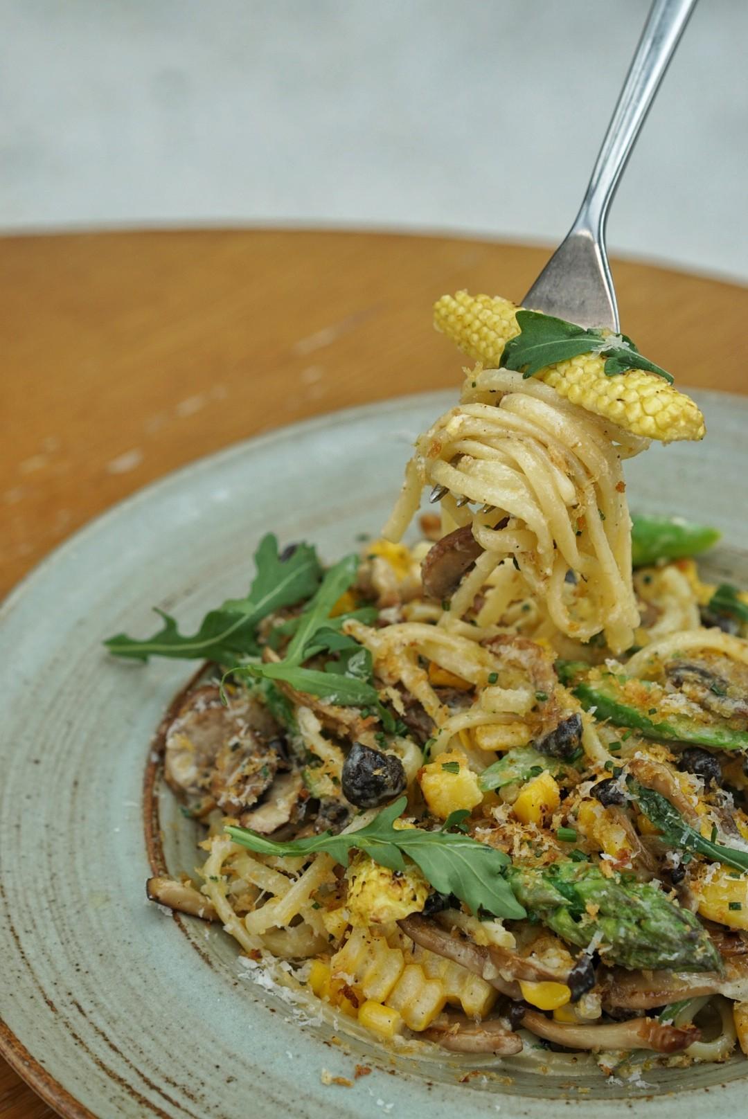 So much more crave-worthy than your standard pasta lunch, the Corn, Asparagus & Smoked Mushroom Linguine is bathed in a lemon cream sauce with pecorino romano – refreshing yet carb-ladenly filling.