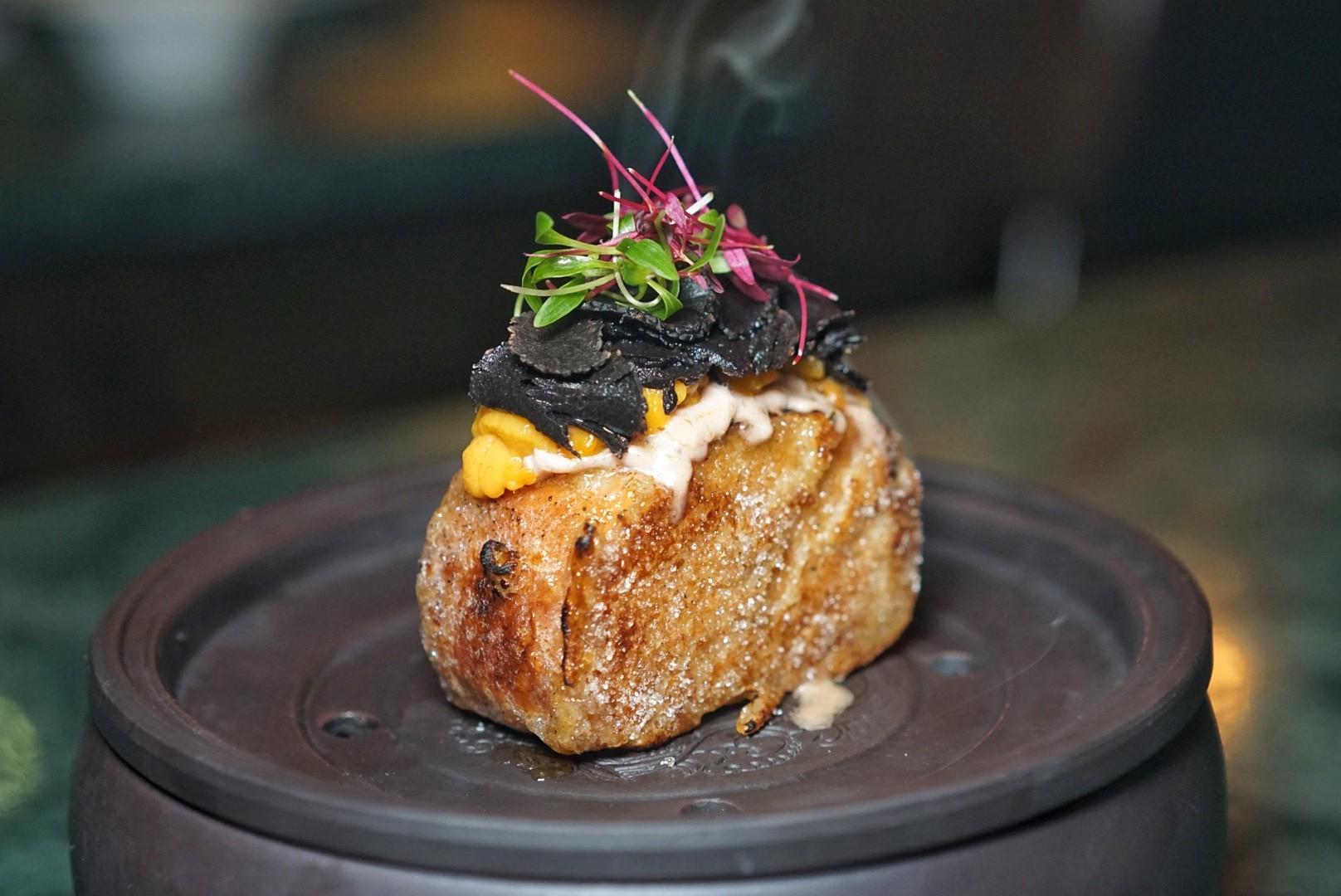 First up is the destined-to-be-wanghong Gion Toast (RMB118) – a brown sugar speckled brioche French toast stuffed with luscious foie gras and gold uni, gilded with Yunnan black truffle.