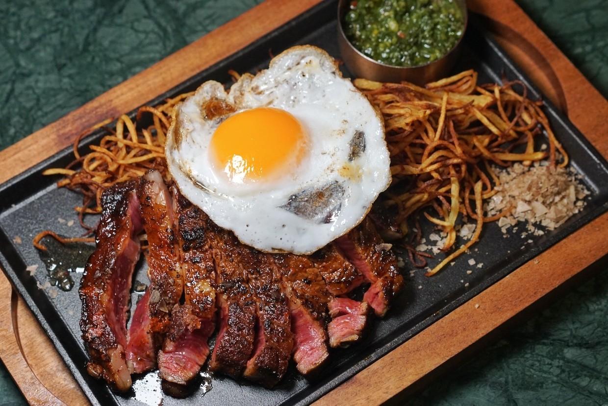 A bright pop of herbaceous citrus from the chimichurri sauce cuts through the steak’s glistening cross-section of charred fat that melts into the potatoes for extra sinful salinity.