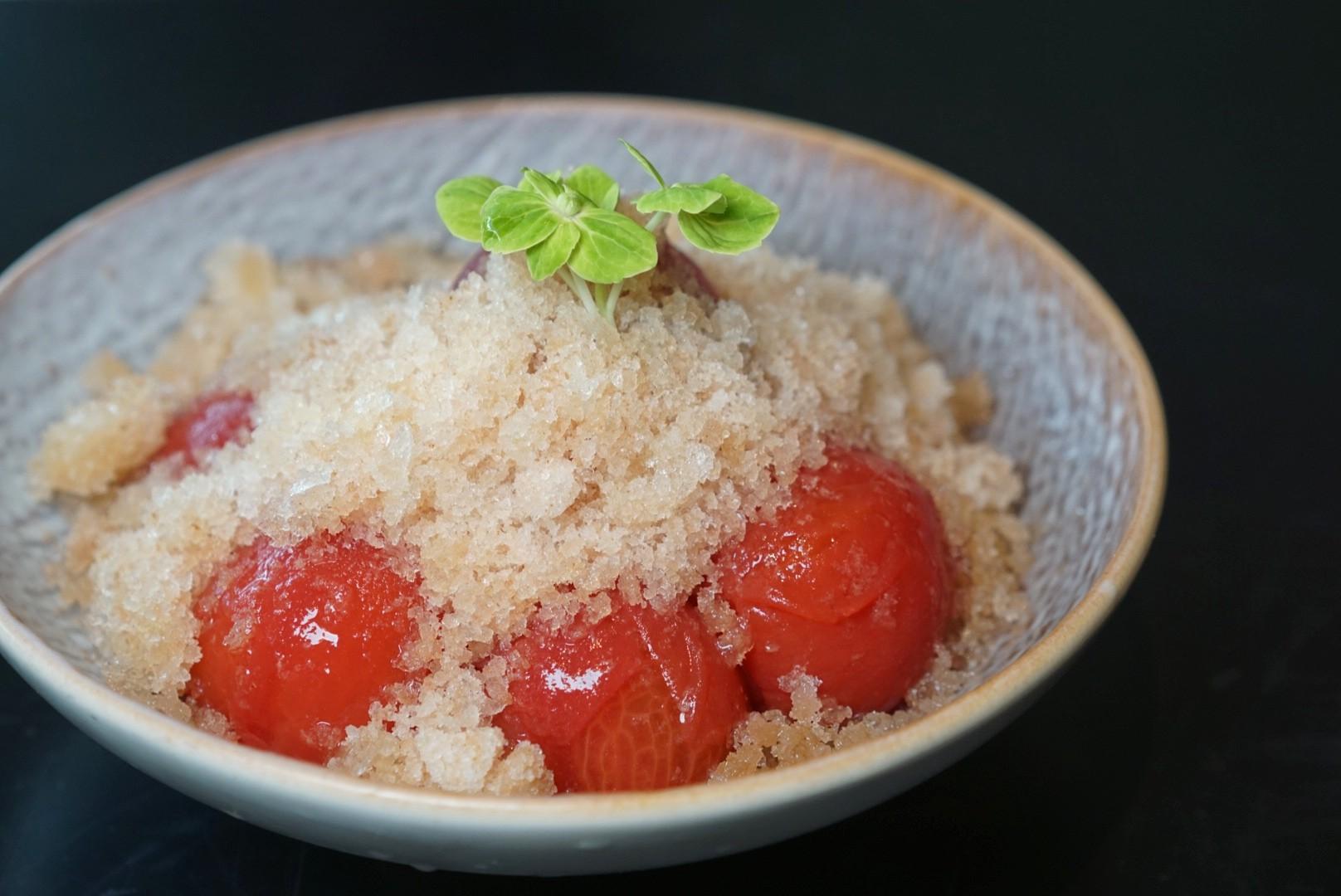 Cold dishes begin with Preserved Tomato resting in a salted plum spiked crushed ice.
