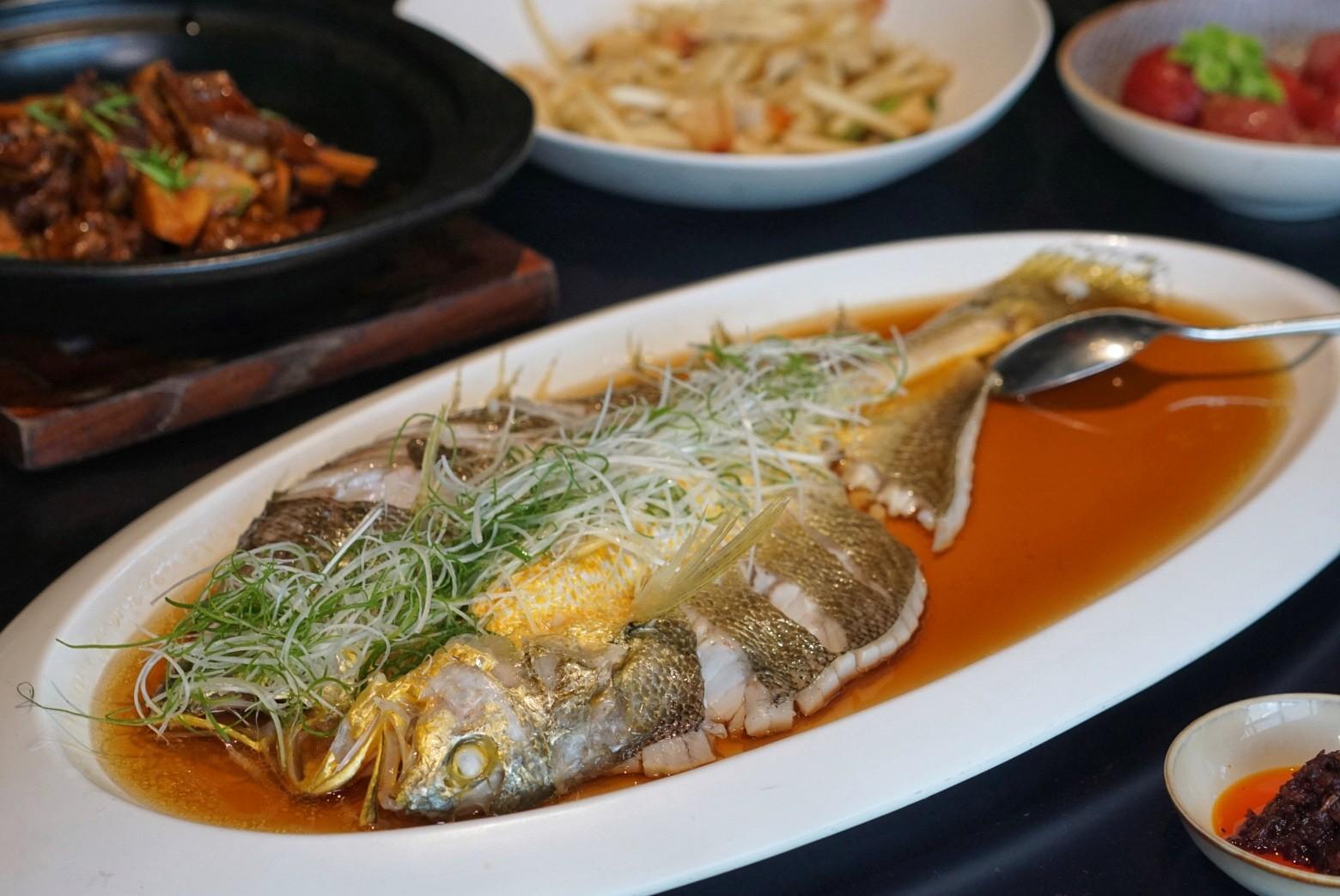 Steaming plates arrive next, full of Stewed Goose Web with morels and shrimp paste, soy sauce Braised Xinjiang Lamb with soft arrowhead mushrooms, and a heaping portion of Steamed Yellow Croaker, resting in 10-year aged rice wine.
