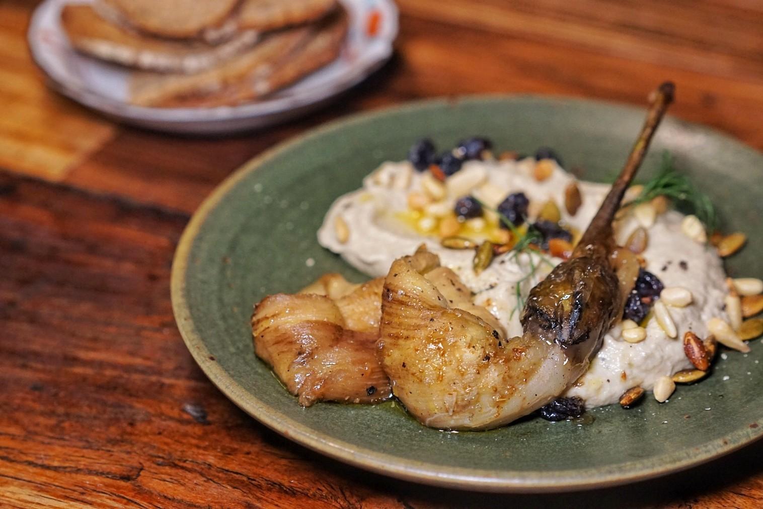 Mr. Willis also just launched a full vegetarian menu to share for 4+ people, coming in at RMB280/person for 10 dishes. Yet, the Smokey Eggplant Tahini (RMB58) is for vegetarians and meat eaters alike, with charred, soft eggplant served atop a batter-like layer of homemade tahini, sprinkled with crunchy pine nuts and tart currants.