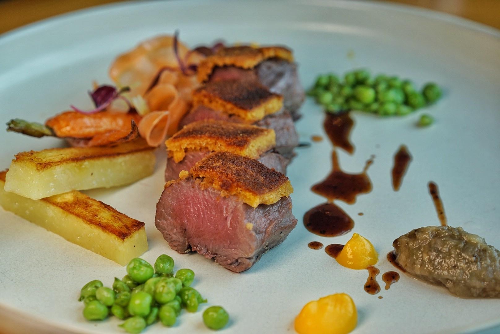 Four tender slices of Slow Cooked Lamb Loin (RMB228) are encrusted with parmesan and flanked by roasted carrots, a sweet quenelle of carrot emulsion, more of the addictingly sweet spring peas and a smoked eggplant caviar.