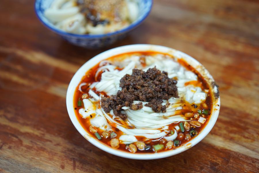 Famous for an array of noodles with various toppings typically eaten for breakfast or as a snack, the three most common varieties span wanza mian (a mixed noodle dish featuring mashed and stewed chickpeas, and minced spicy pork, either served dry or in soup), xiao mian (a fiery, lip-tingling dry or soup noodle dish of noodles simply splashed with spicy chili oil, Sichuan pepper, and vegetables), and dan dan mian (dry noodles swaddled in chili oil, seasoned ground pork, peanuts and pickled vegetables). These noodle varieties can be found at nearly every street corner in the city, with each shop having its own slight variation and spice level.