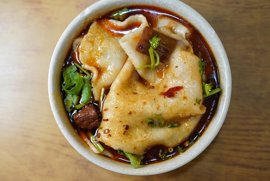 Known as “bedspread noodles,” these pasta sheets are made by artisan noodle makers around Chengdu, Chongqing and neighboring villages. A hunk of dough is first ripped from a heaping mound and stretched to the size (and weight) of mini blankets – roughly 12-inches long (30cm) and 3-inches wide (8cm), and tossed haphazardly into a simmering pot of water to cook for just two minutes. Thick with that QQ chew, the blanket noodles are usually served swimming in a meat-heavy broth with chickpeas and garlic.