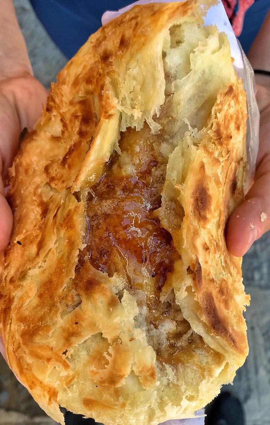 Hong tang bing, little baked dough balls known as brown sugar buns, are crispy on the outside, doughy on the inside and filled to the brim with ooey-gooey melted brown sugar. As the bing bakes in a clay drum oven – think those massive ovens used to make naan bread – the brown sugar liquefies into a syrup consistency. The first bite releases an avalanche of molten sugar.