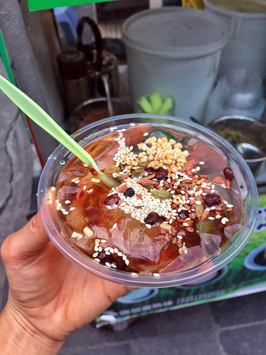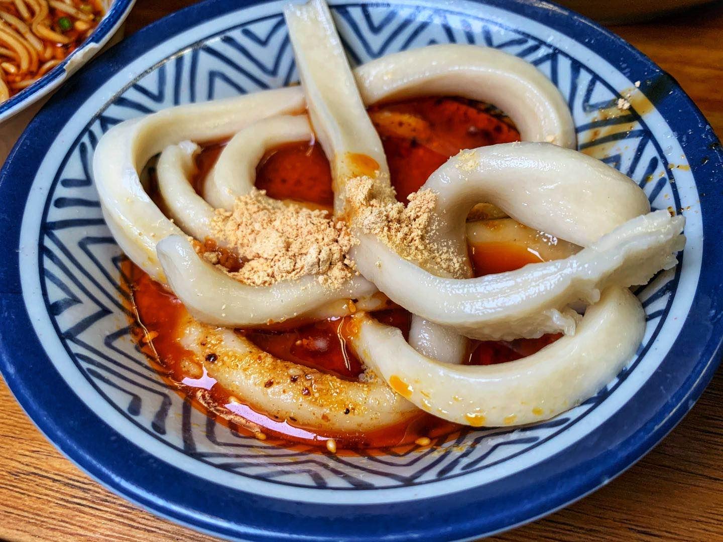 Bing fen is Sichuan’s answer to the United States’ JELLO and the UK’s jelly. It’s light, sweet and cold, everything we want after a heat wave of a meal. The ice jelly is made from rice powder, bean powder or potato starch, giving it a glutinous texture but not as sticky as mochi. The bing fen is topped with light brown sugar syrup and other garnishes like sesame seeds, peanuts, raisins and dried hawthorn for a textural contrast.