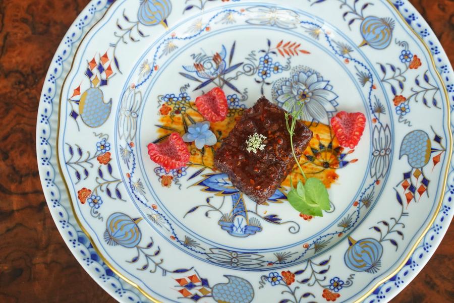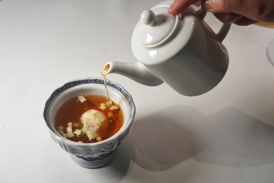 Using Chaoshan cooking techniques, like poaching, steaming, and braising, dishes are notably light and fresh, allowing the seafood’s inherent sweetness, the produce’s nuanced vegetal notes, and the beef’s characteristic gaminess to shine. Small details mirror chef Jianqing’s meticulousness – server stations are heated so silverware arrives tableside warm to the touch; golden sea cucumber is methodically rehydrated via soaking, steaming, boiling, and cleaning over four days before being served; and even juicy Yunnan-grown blueberries are assembled in a pleated pattern, precisely stacked one by one before serving.