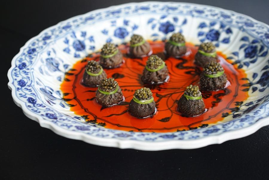 At Ling Long Shanghai, there are white tablecloths, avant-garde Chinese art-decorated walls in crimson and onyx hues, and gloved service, yet it diverges from the modern Chinese fine dining trend in that the meal follows a whimsical path, leading guests further down the (white) rabbit hole. The level of tongue-in-cheek eccentrics build throughout, resulting in each course more imaginative than the last.