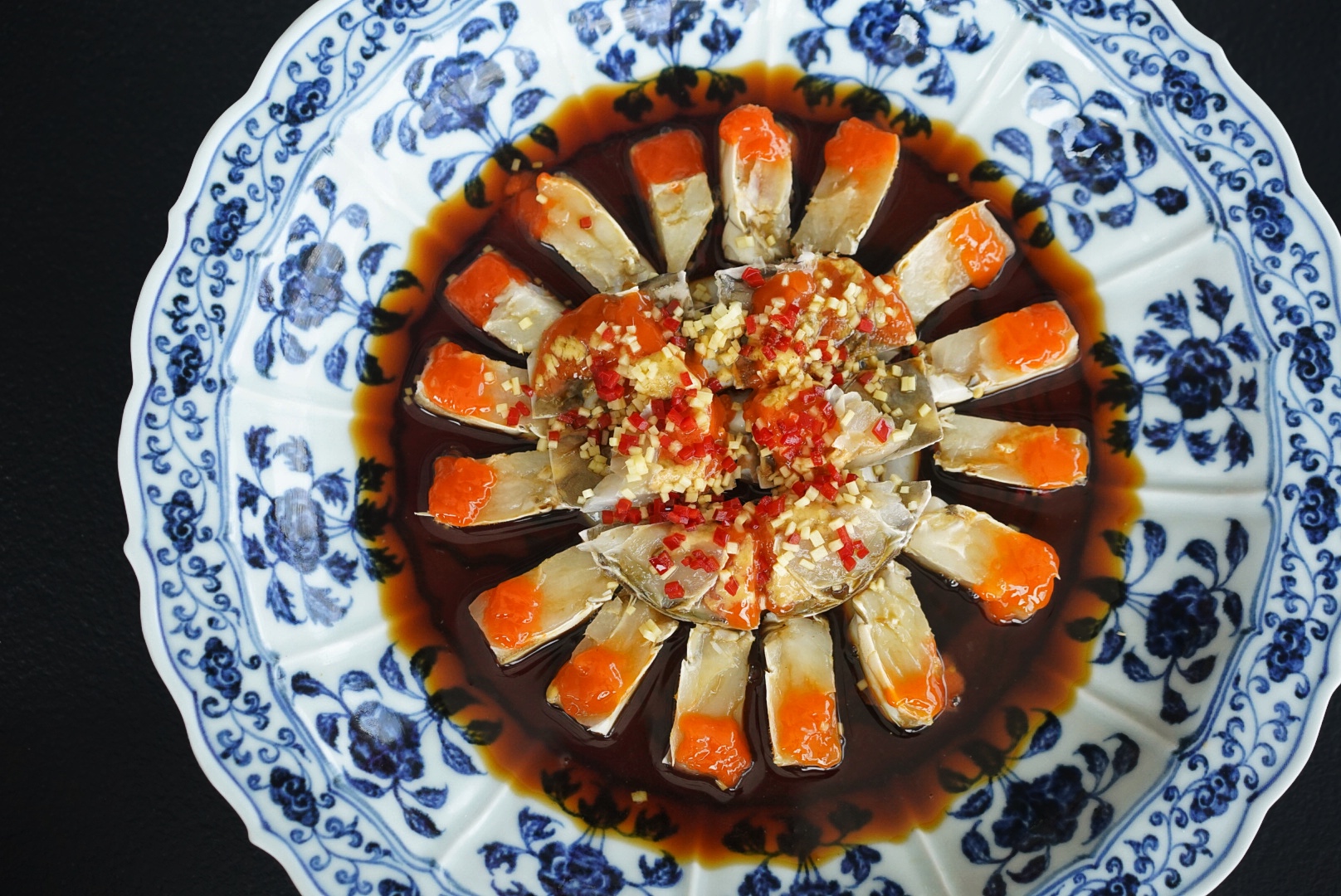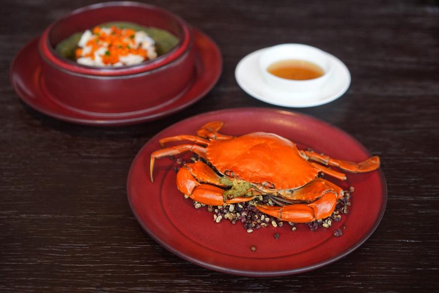The restaurant’s focus, shipped-in-daily seafood from Ningbo, is fastidiously prepared to accentuate its natural flavors while showcasing seasonality at its finest. Think swimmer crab marinated in aged Shaoxing wine with ginger and soy sauce, beef tripe in fiery chili oil, smoked stone frog legs, pan-seared Zhangzidao scallops with local fermented soybean paste, and fried Wagyu beef with aged tangerine peel and tart raspberries.