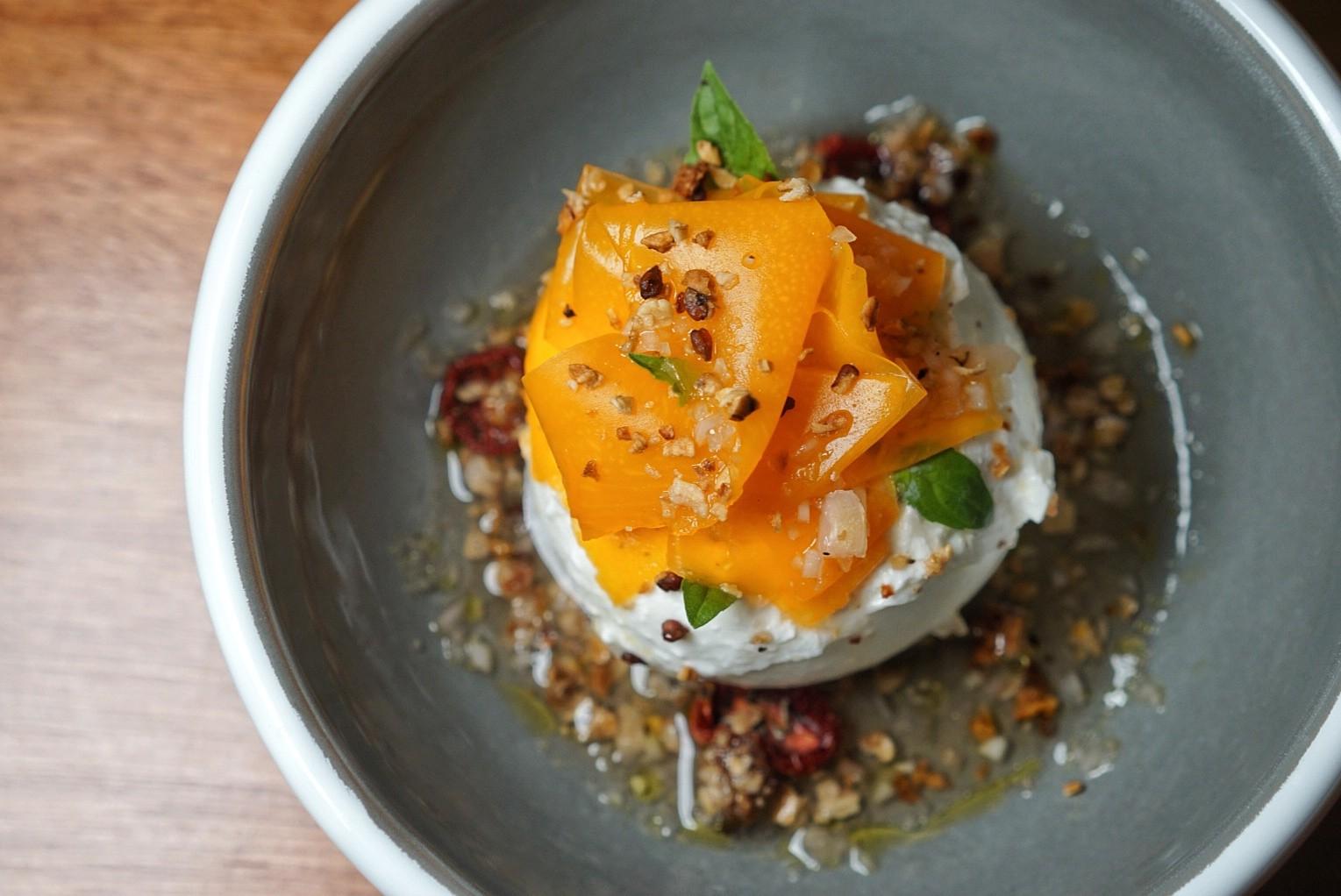 A cold globe of Fresh Burrata (RMB68) is crowned with ribbons of pickled pumpkin, a drizzle of honey and crunchy homemade granola and seeds.