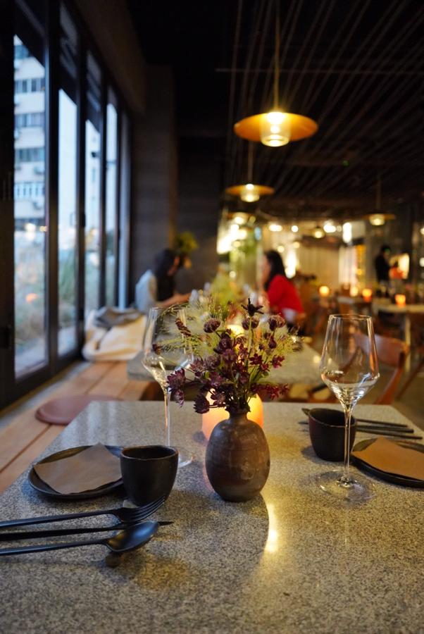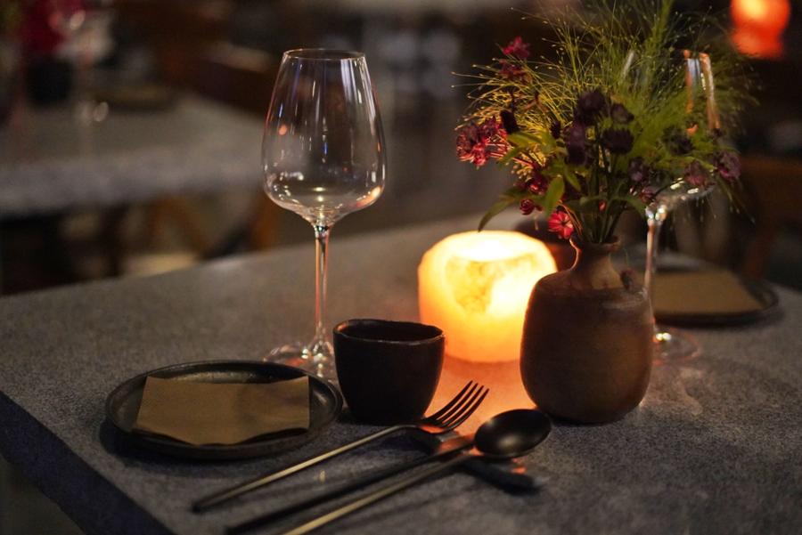 The layout encourages a communal dining experience, with seating for 58 indoors and an outdoor terrace for an al fresco option. The soft ambient lighting and carefully curated natural floral arrangements contribute to a calming vibe, inviting diners to slow down and savor their meals.