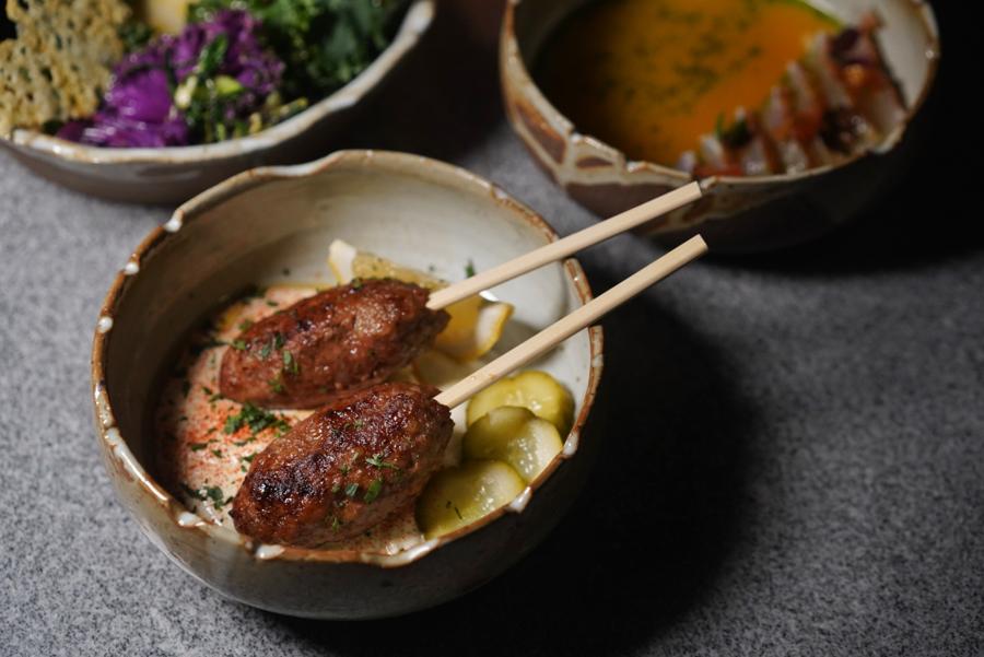 The Lamb with Cumin on Yogurt (RMB68) brings together the robust flavors of wood-fired minced lamb kebab seasoned with cumin, served over a bed of creamy yogurt, a nod to the Middle East.