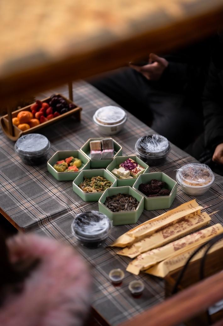 Tea masters present guests with a tea pouring ceremony, along with breakfast in the morning and local snacks in the afternoon – like youdunzi, or fried radish cakes, and chou doufu, an elevated version of the China-famous street snack, stinky tofu.